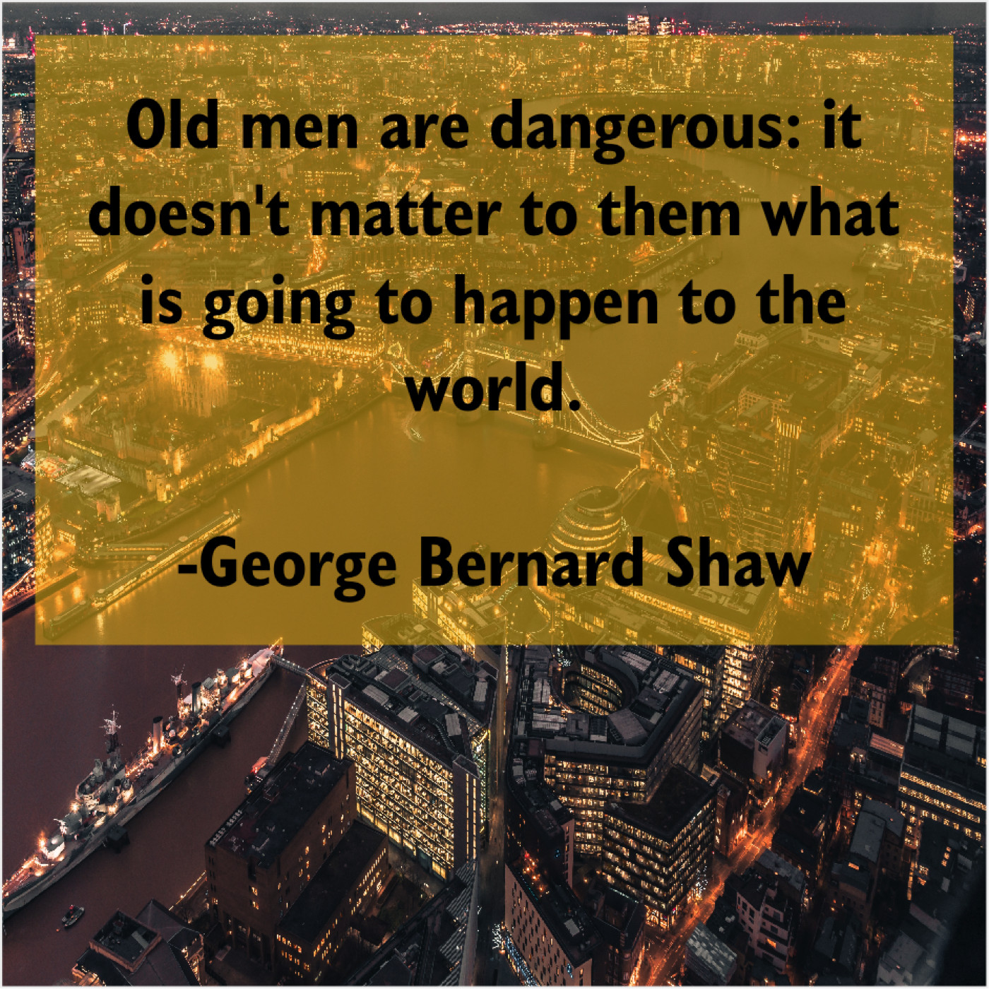 George Bernard Shaw George Bernard Shaw – Old men are dangerous: it… December 23, 2018 admin “Old men are dangerous: it doesn’t matter to them what is going to happen to the world.”-George Bernard Shaw