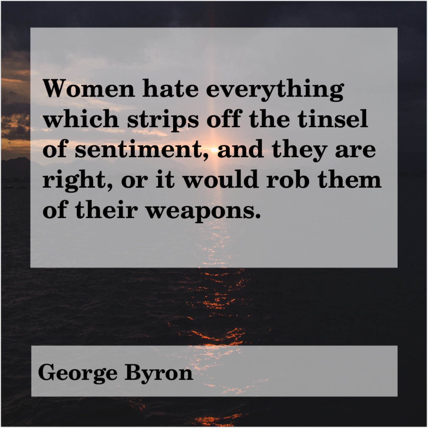 George Byron George Byron – Women hate everything which strips… January 11, 2019 admin “Women hate everything which strips off the tinsel of sentiment, and they are right, or it would rob them of their weapons.”-George Byron