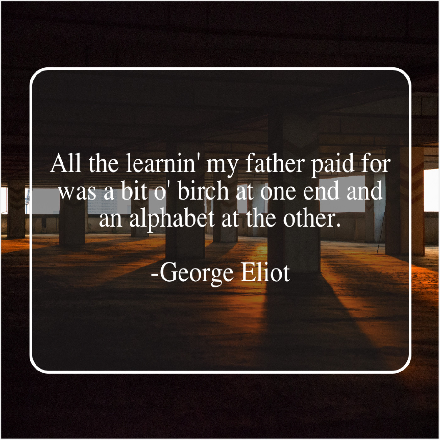 George Eliot George Eliot – All the learnin’ my father… January 14, 2019 admin “All the learnin’ my father paid for was a bit o’ birch at one end and an alphabet at the other.”-George Eliot