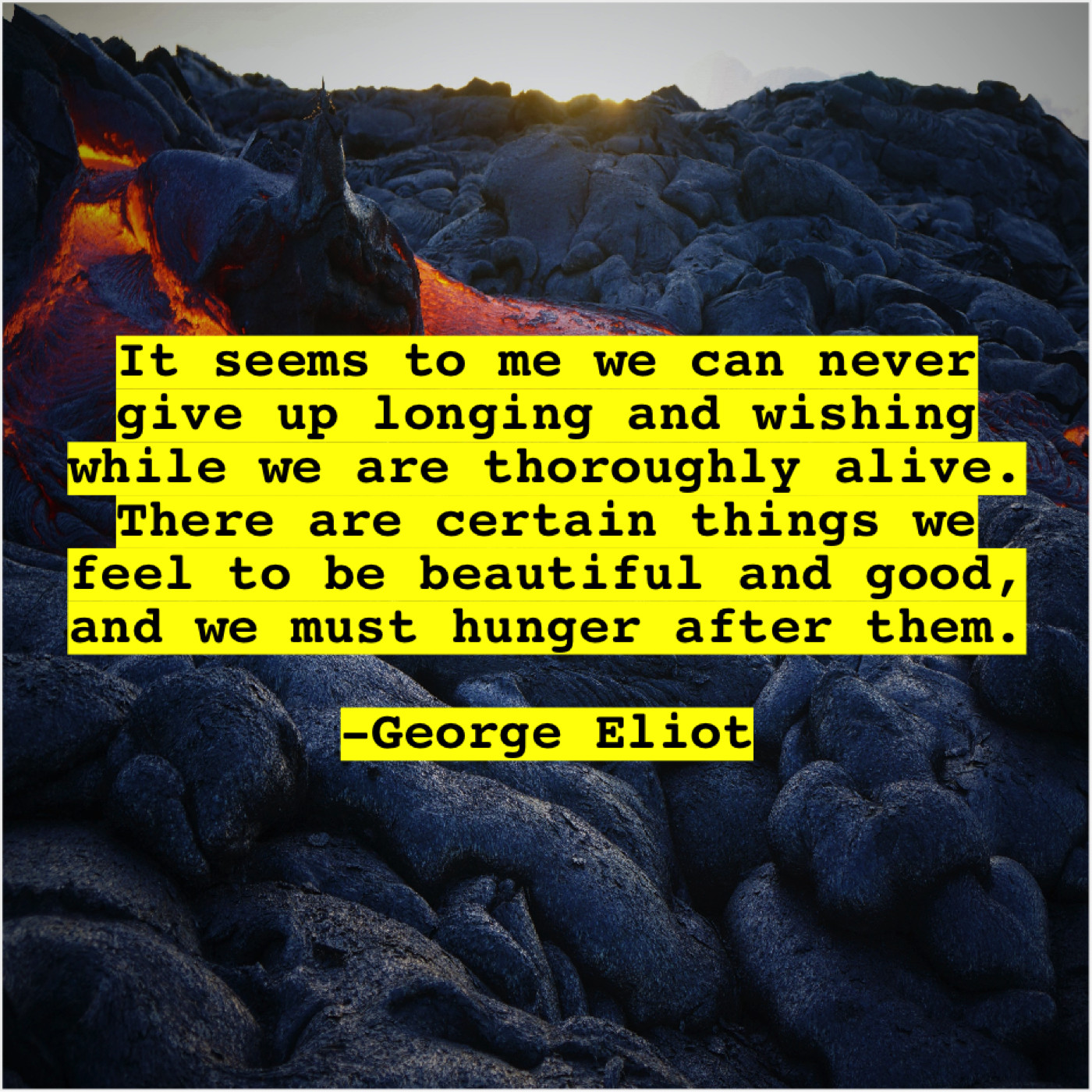 George Eliot George Eliot – It seems to me we… October 14, 2019 admin “It seems to me we can never give up longing and wishing while we are thoroughly alive. There are certain things we feel to be beautiful and good, and we must hunger after them.”-George Eliot