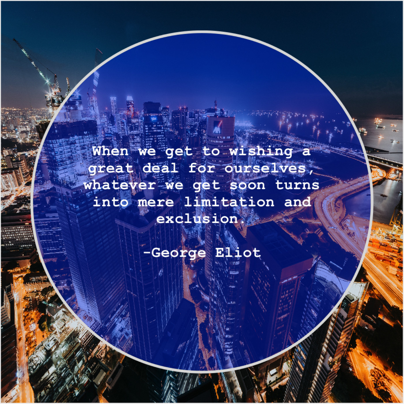 George Eliot George Eliot – When we get to wishing… July 8, 2019 admin “When we get to wishing a great deal for ourselves, whatever we get soon turns into mere limitation and exclusion.”-George Eliot