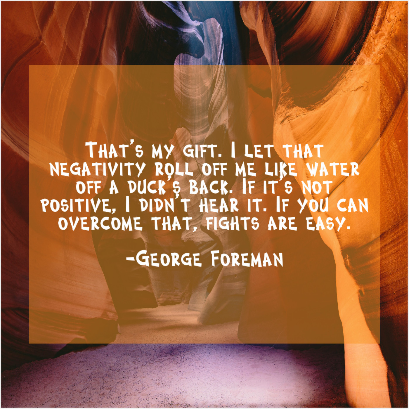 George Foreman George Foreman – That’s my gift. I let… April 4, 2019 admin “That’s my gift. I let that negativity roll off me like water off a duck’s back. If it’s not positive, I didn’t hear it. If you can overcome that, fights are easy.”-George Foreman