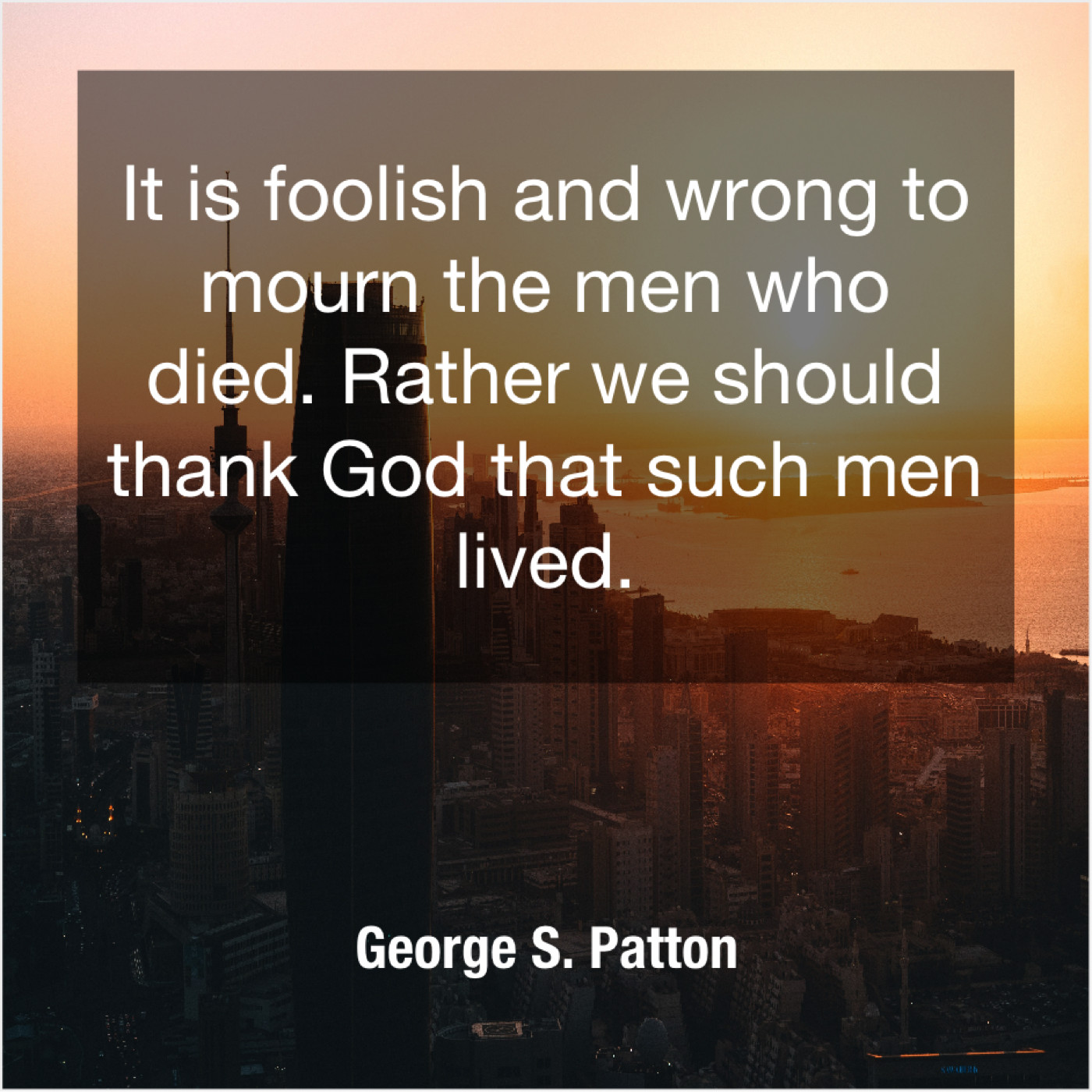 George S. Patton George S. Patton – It is foolish and wrong… March 23, 2019 admin “It is foolish and wrong to mourn the men who died. Rather we should thank God that such men lived.”-George S. Patton
