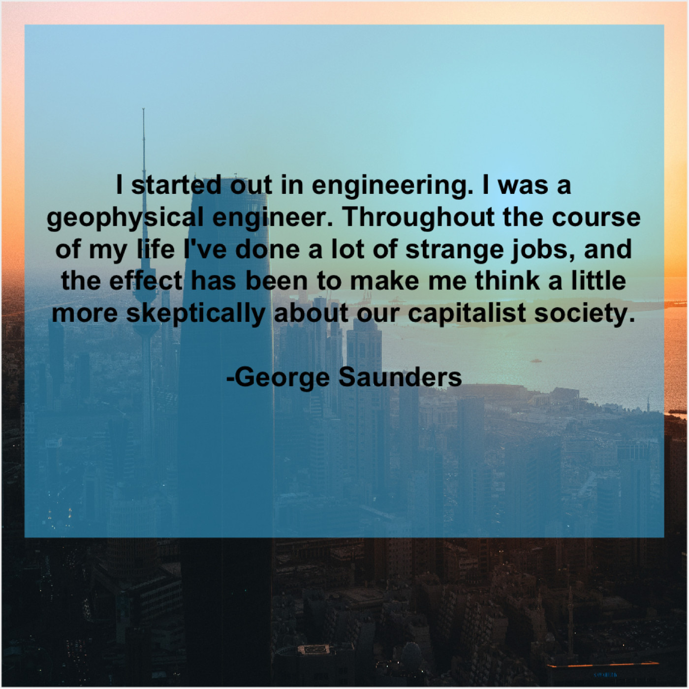 George Saunders George Saunders – I started out in engineering… January 14, 2019 admin “I started out in engineering. I was a geophysical engineer. Throughout the course of my life I’ve done a lot of strange jobs, and the effect has been to make me think a little more skeptically about our capitalist society.”-George Saunders