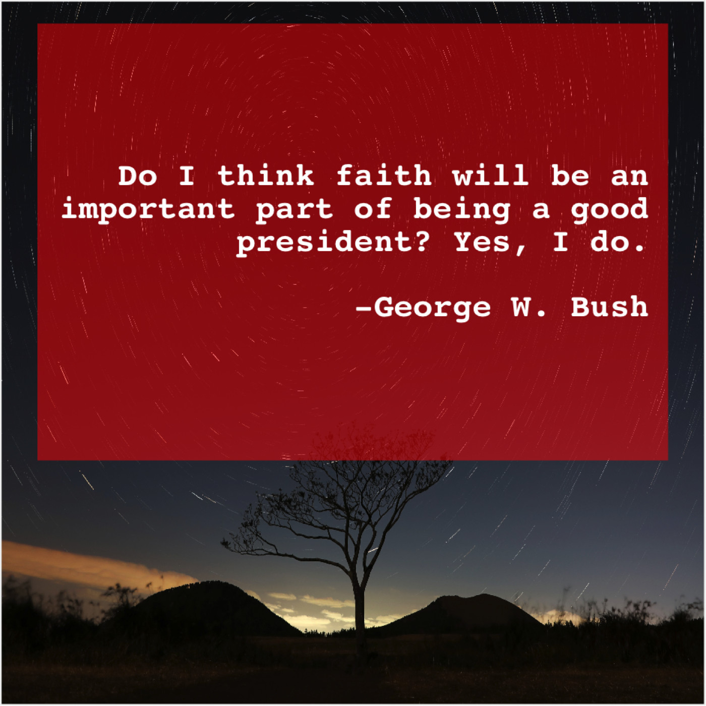 George W. Bush George W. Bush – Do I think faith will… July 5, 2019 admin “Do I think faith will be an important part of being a good president? Yes, I do.”-George W. Bush