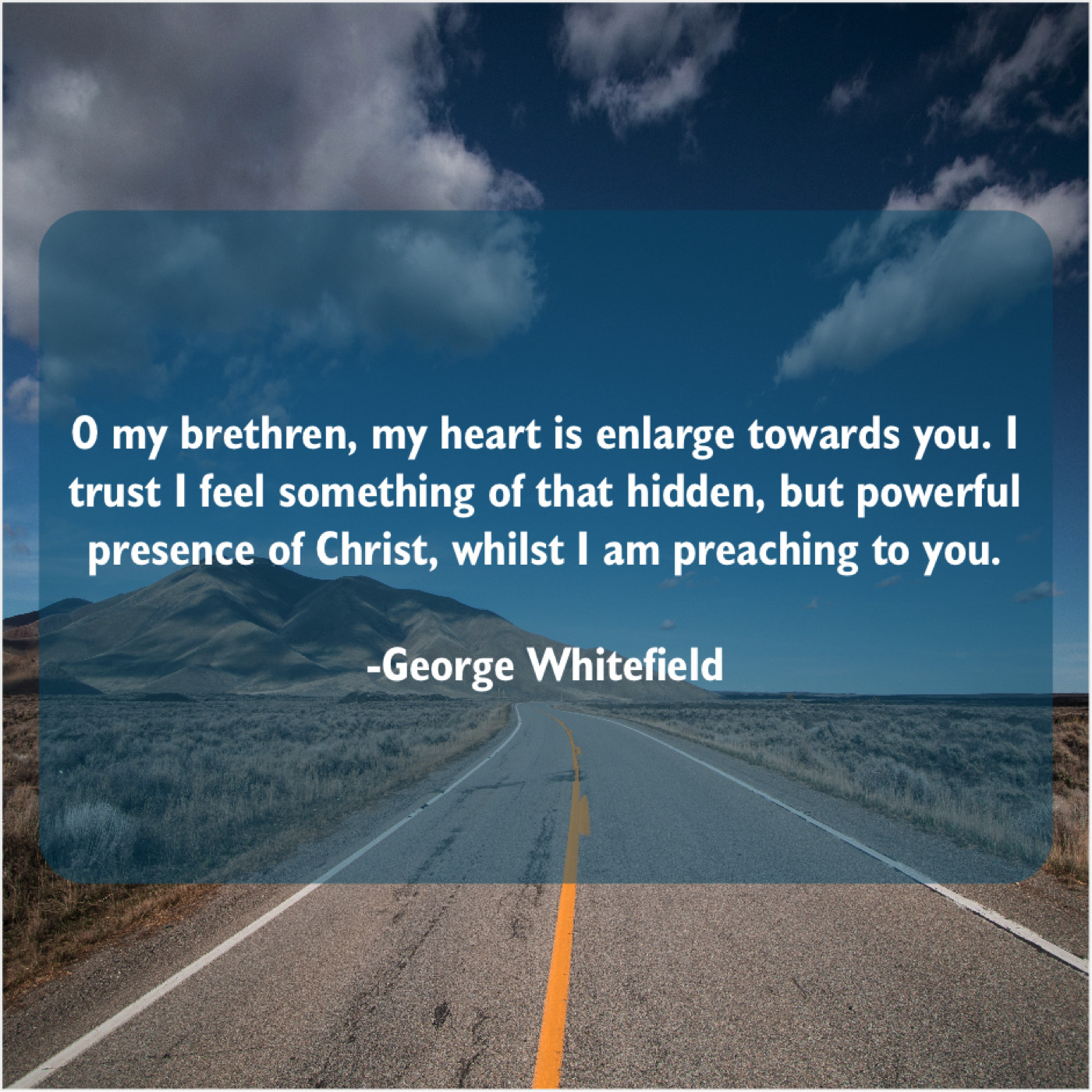 George Whitefield George Whitefield – O my brethren, my heart… July 22, 2019 admin “O my brethren, my heart is enlarge towards you. I trust I feel something of that hidden, but powerful presence of Christ, whilst I am preaching to you.”-George Whitefield