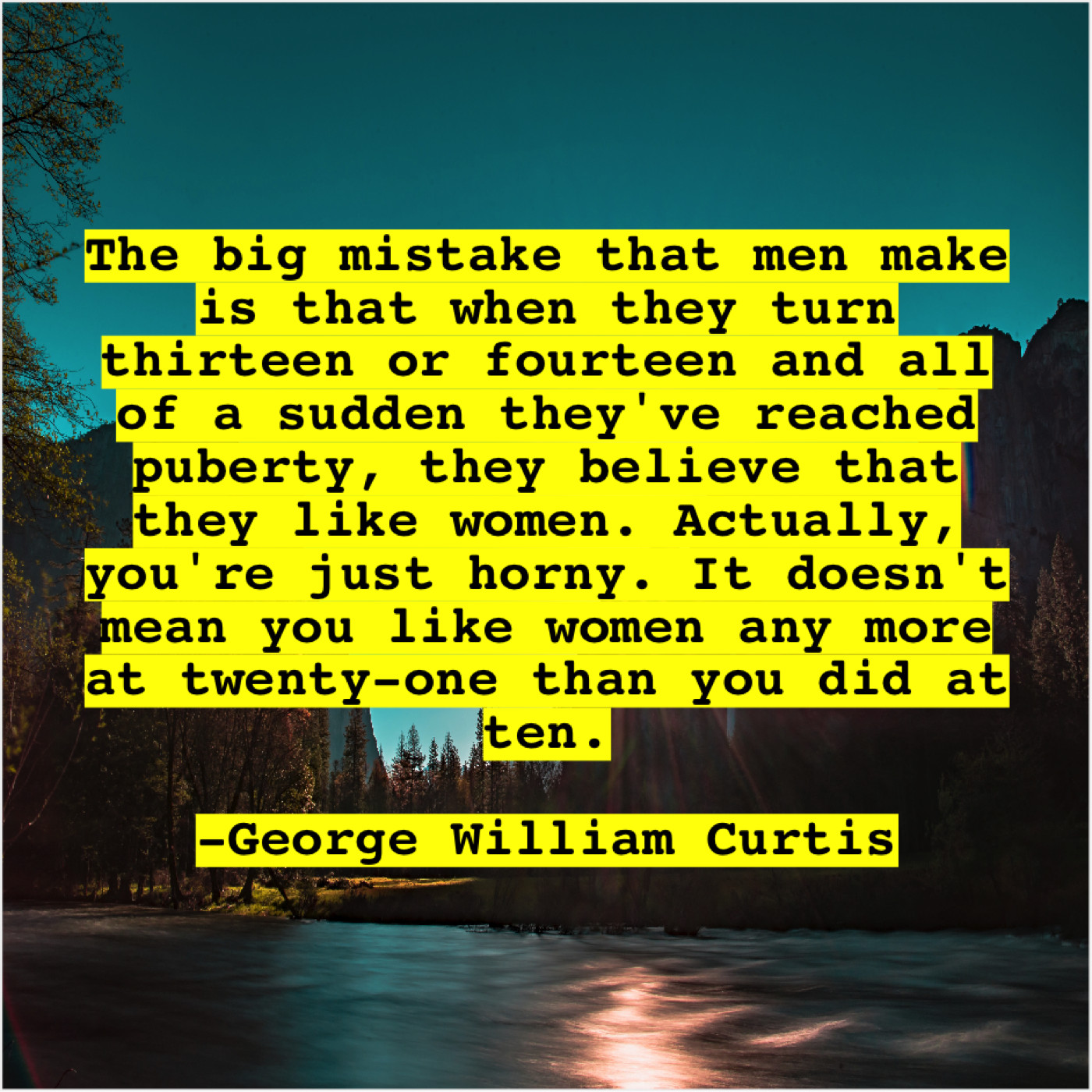 “The big mistake that men make is that when they turn thirteen or fourteen and all of a sudden they’ve reached puberty, they believe that they like women. Actually, you’re just horny. It doesn’t mean you like women any more at twenty-one than you did at ten.”