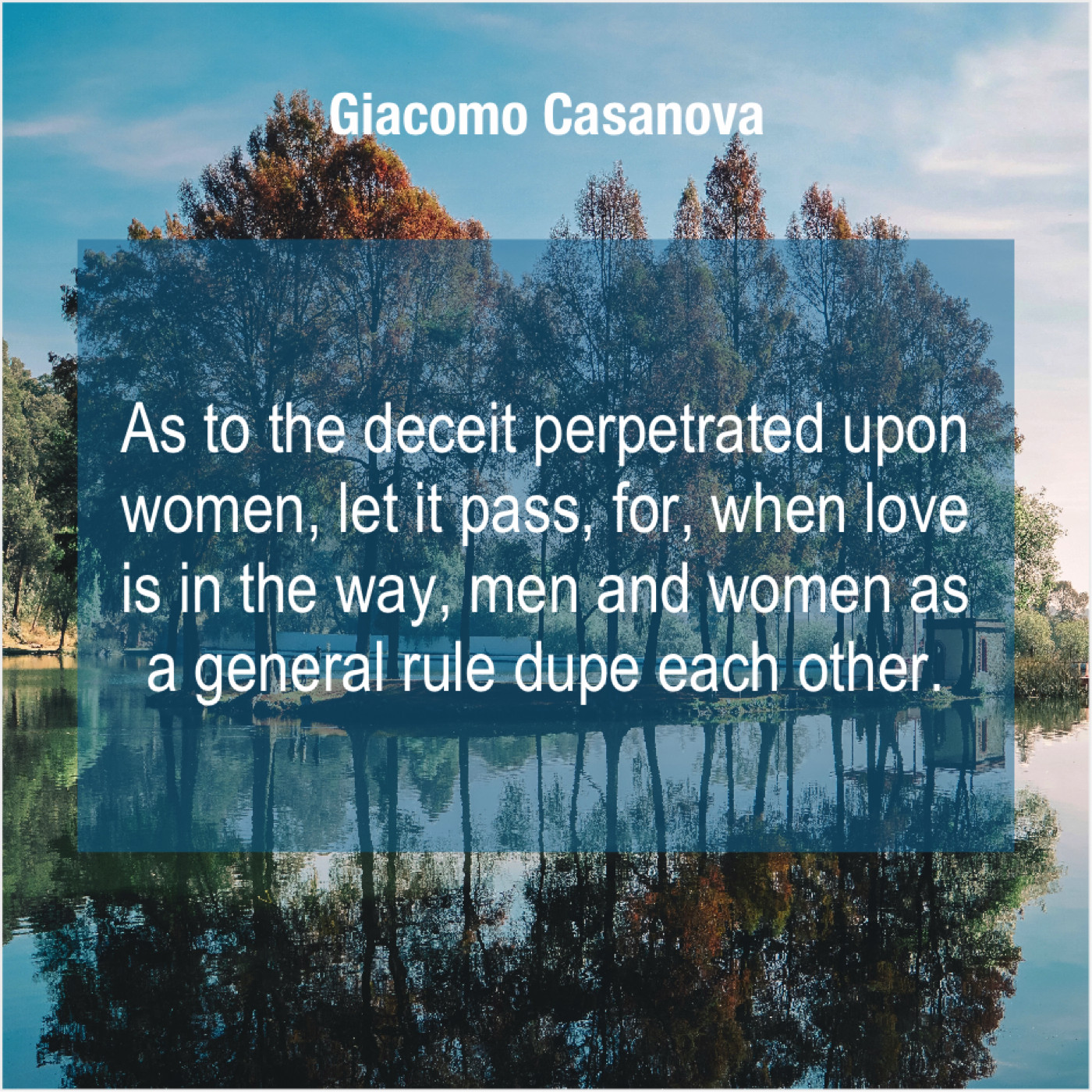 Giacomo Casanova Giacomo Casanova – As to the deceit perpetrated… September 12, 2019 admin “As to the deceit perpetrated upon women, let it pass, for, when love is in the way, men and women as a general rule dupe each other.”-Giacomo Casanova