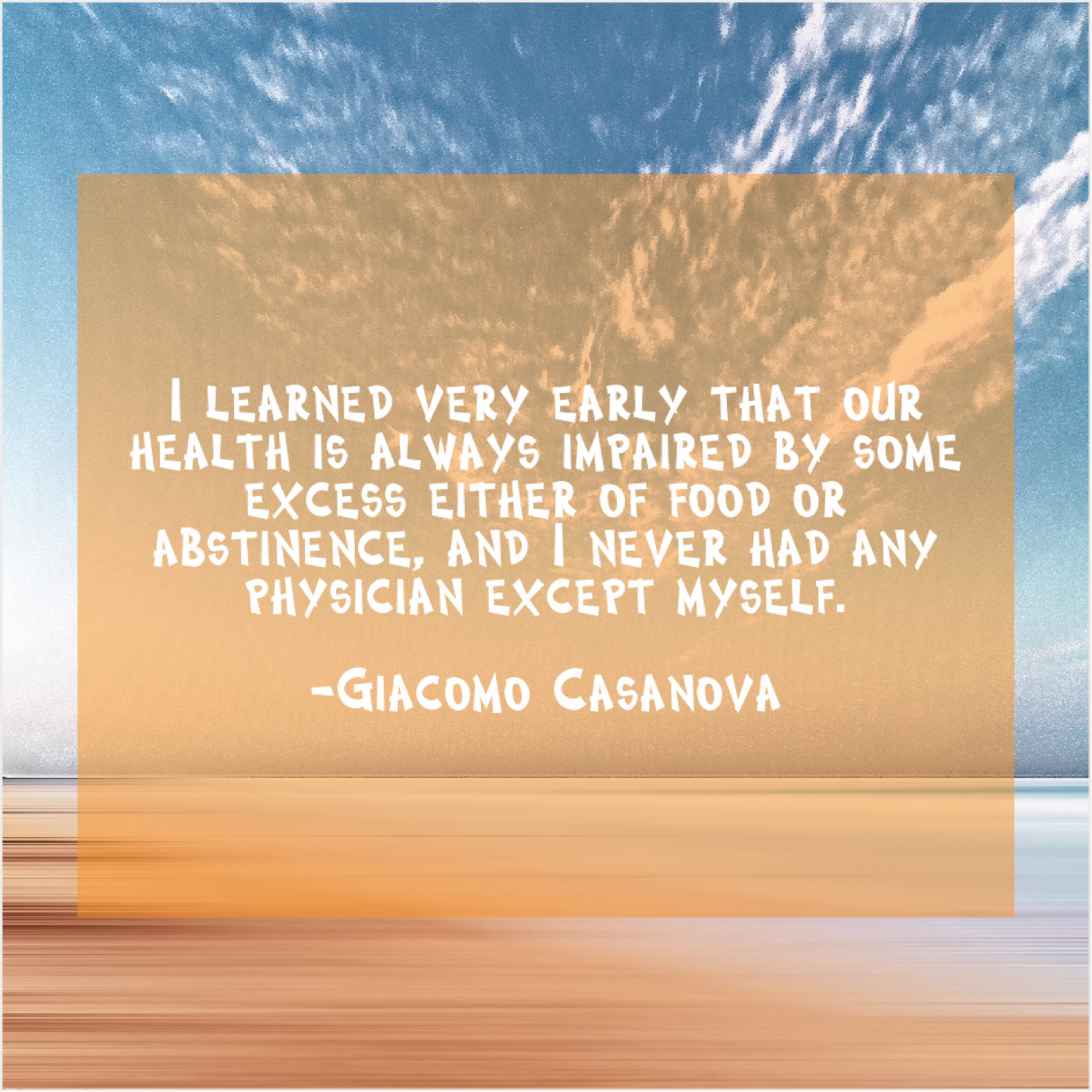 Giacomo Casanova Giacomo Casanova – I learned very early that… May 8, 2019 admin “I learned very early that our health is always impaired by some excess either of food or abstinence, and I never had any physician except myself.”-Giacomo Casanova