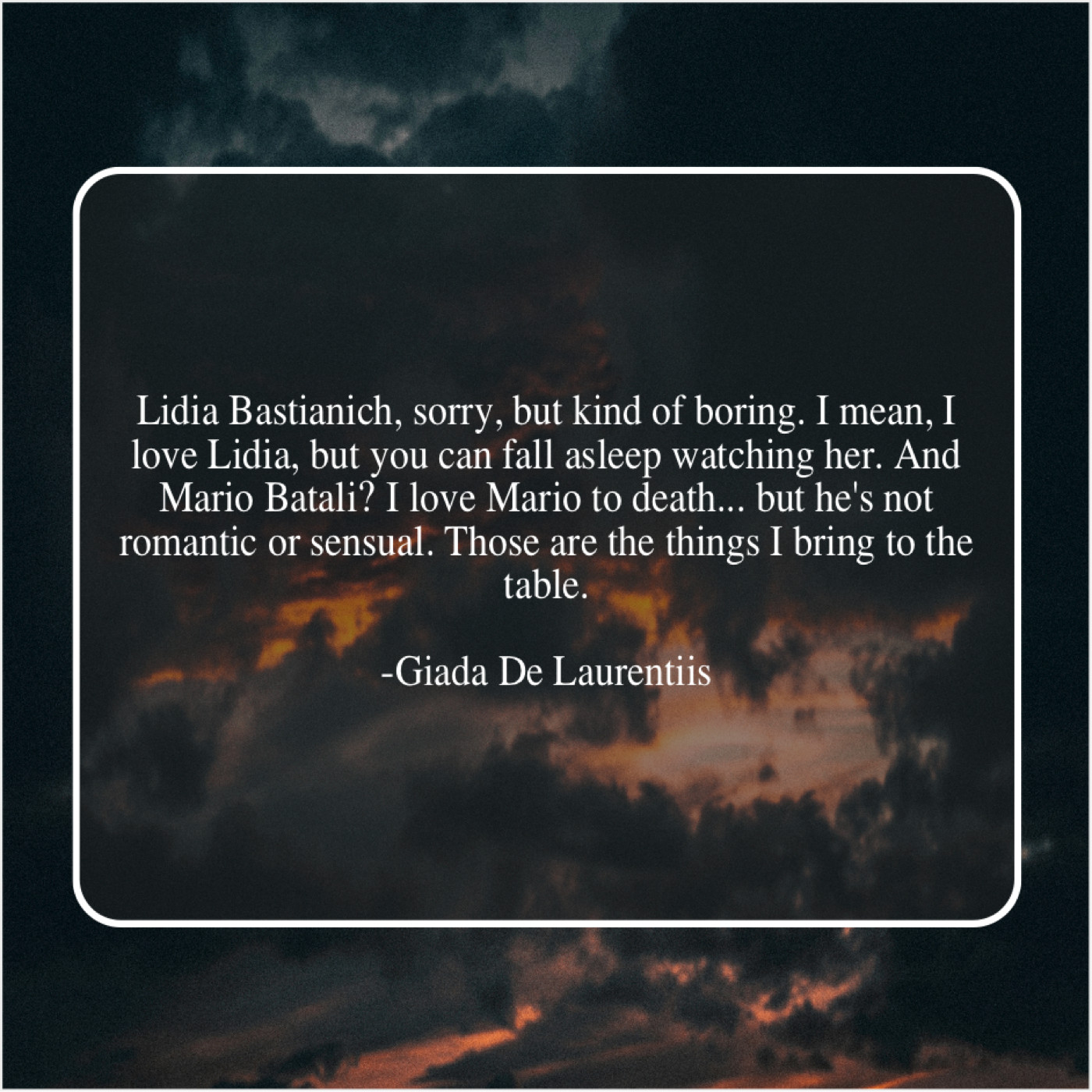 Giada De Laurentiis Giada De Laurentiis – Lidia Bastianich, sorry, but kind… August 17, 2019 admin “Lidia Bastianich, sorry, but kind of boring. I mean, I love Lidia, but you can fall asleep watching her. And Mario Batali? I love Mario to death… but he’s not romantic or sensual. Those are the things I bring to the table.”-Giada De Laurentiis