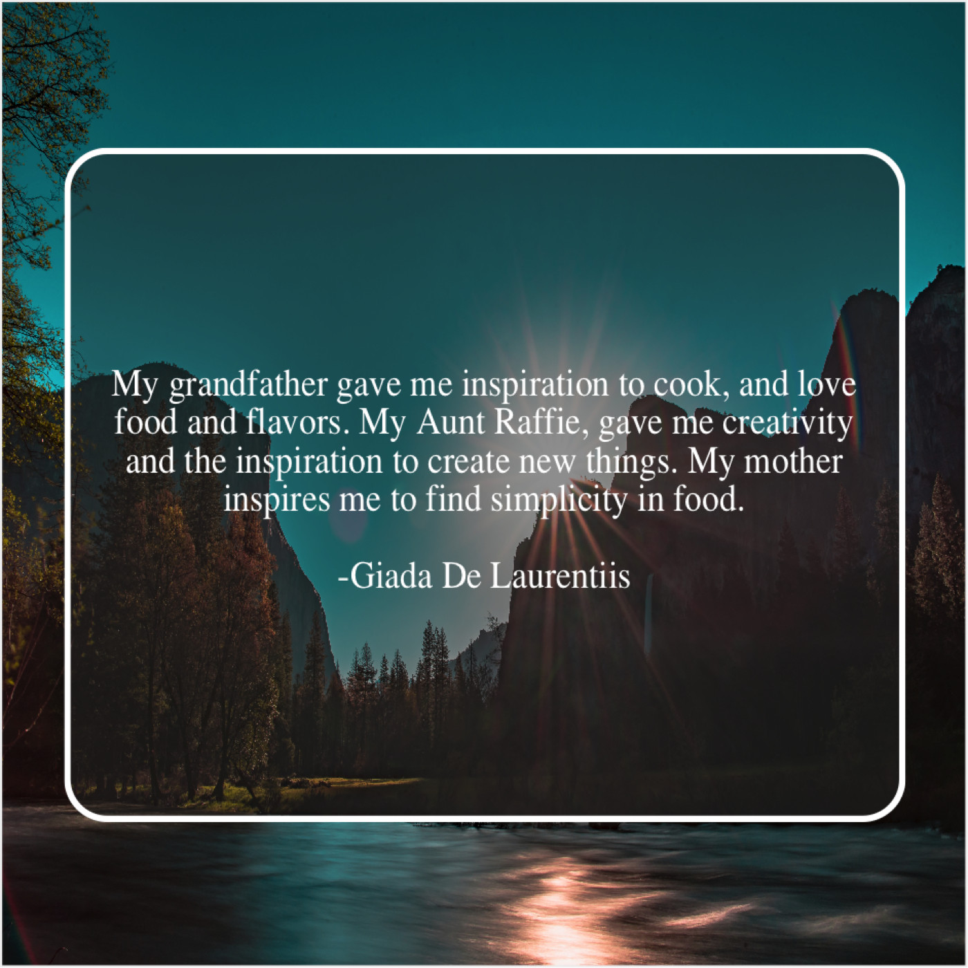 Giada De Laurentiis Giada De Laurentiis – My grandfather gave me inspiration… July 4, 2019 admin “My grandfather gave me inspiration to cook, and love food and flavors. My Aunt Raffie, gave me creativity and the inspiration to create new things. My mother inspires me to find simplicity in food.”-Giada De Laurentiis