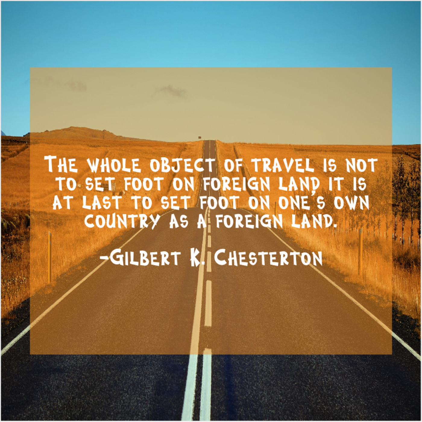 Gilbert K. Chesterton Gilbert K. Chesterton – The whole object of travel… January 18, 2019 admin “The whole object of travel is not to set foot on foreign land it is at last to set foot on one’s own country as a foreign land.”-Gilbert K. Chesterton