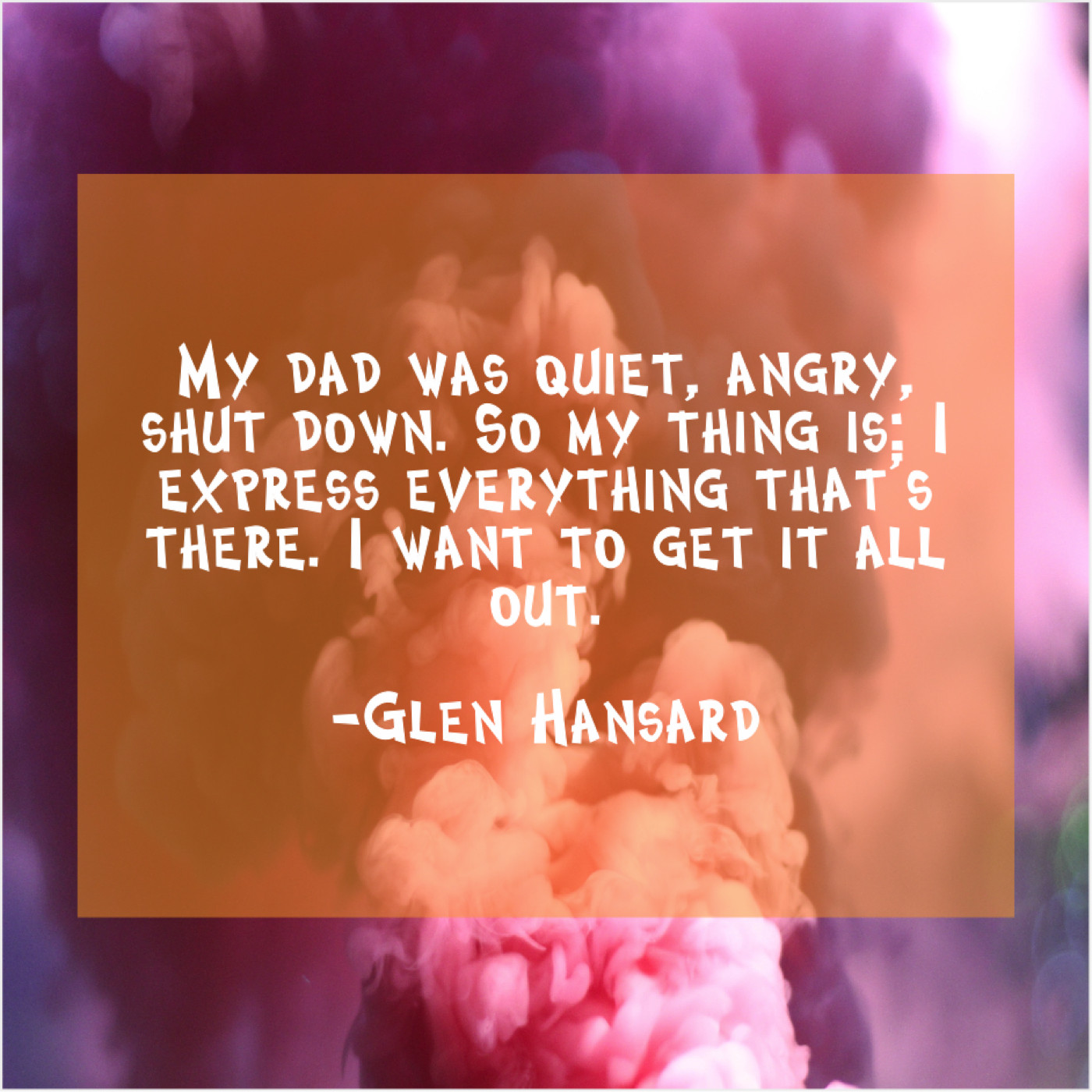 Glen Hansard Glen Hansard – My dad was quiet, angry… June 30, 2019 admin “My dad was quiet, angry, shut down. So my thing is: I express everything that’s there. I want to get it all out.”-Glen Hansard