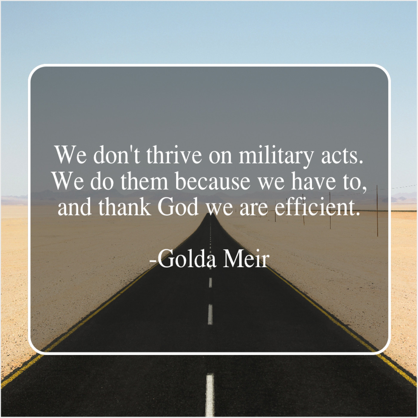 Golda Meir Golda Meir – We don’t thrive on military… July 5, 2019 admin “We don’t thrive on military acts. We do them because we have to, and thank God we are efficient.”-Golda Meir