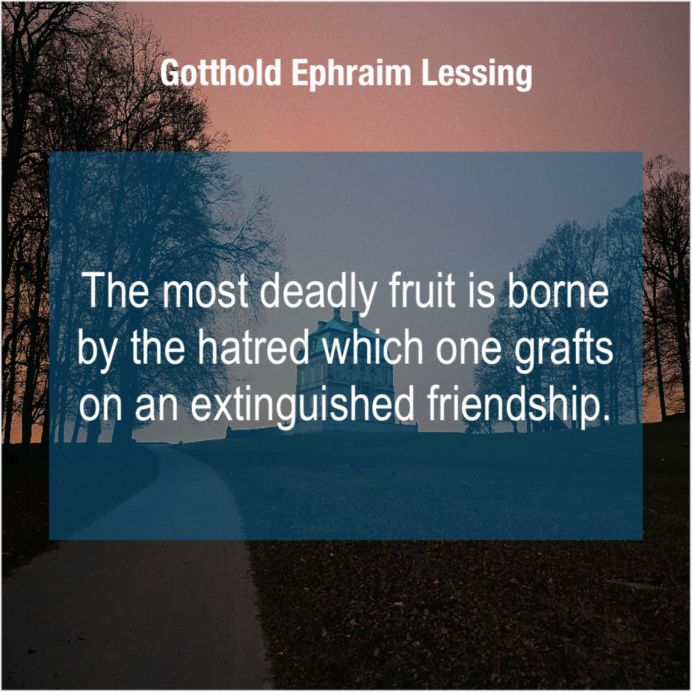 Gotthold Ephraim Lessing Gotthold Ephraim Lessing – The most deadly fruit is… September 5, 2019 admin “The most deadly fruit is borne by the hatred which one grafts on an extinguished friendship.”-Gotthold Ephraim Lessing