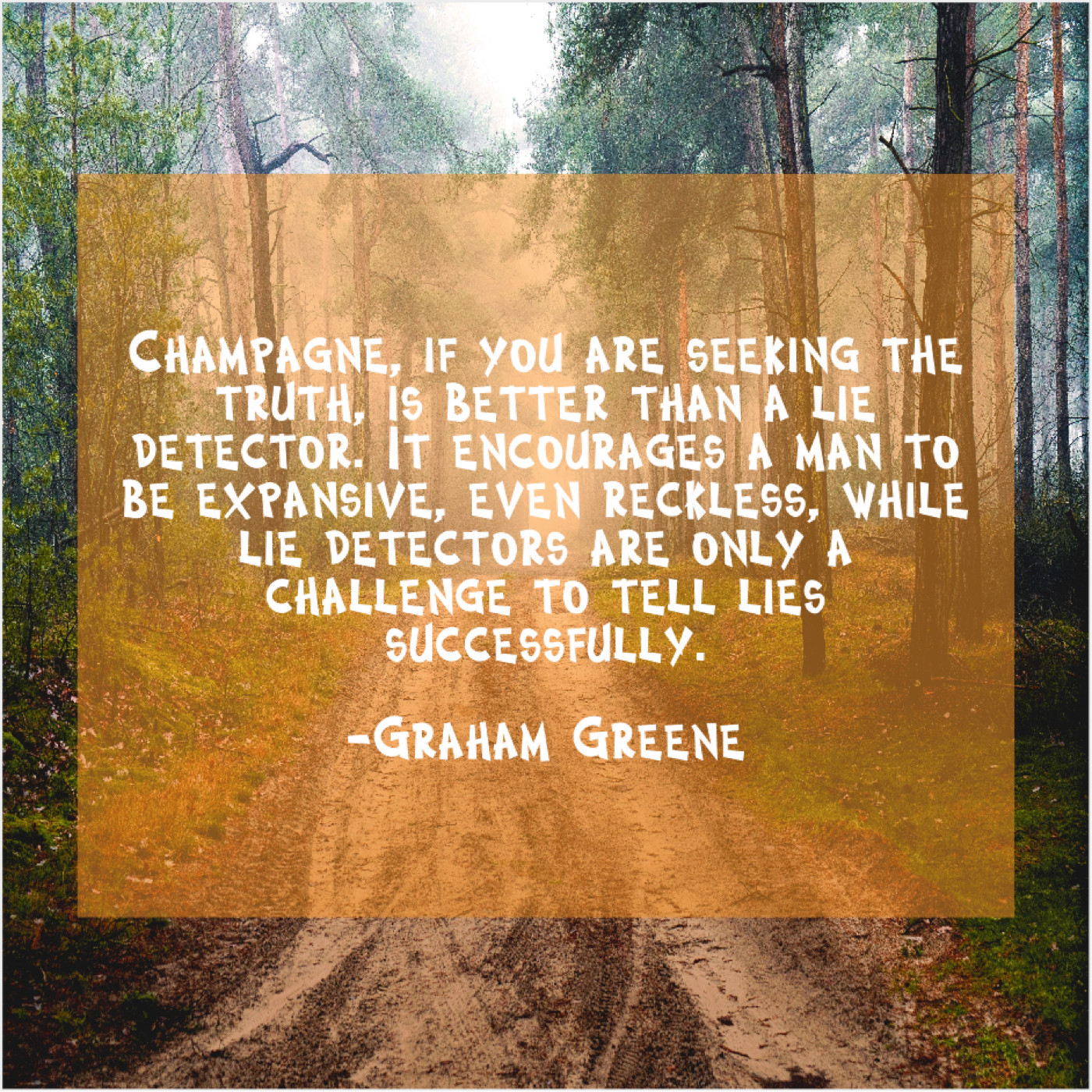 Graham Greene Graham Greene – Champagne, if you are seeking… October 31, 2018 admin “Champagne, if you are seeking the truth, is better than a lie detector. It encourages a man to be expansive, even reckless, while lie detectors are only a challenge to tell lies successfully.”-Graham Greene
