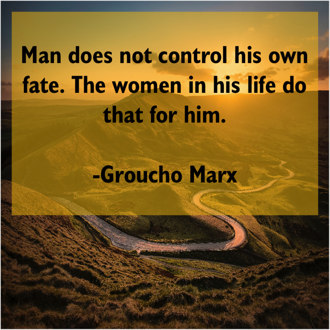 Groucho Marx Groucho Marx – Man does not control his… February 14, 2019 admin “Man does not control his own fate. The women in his life do that for him.”-Groucho Marx
