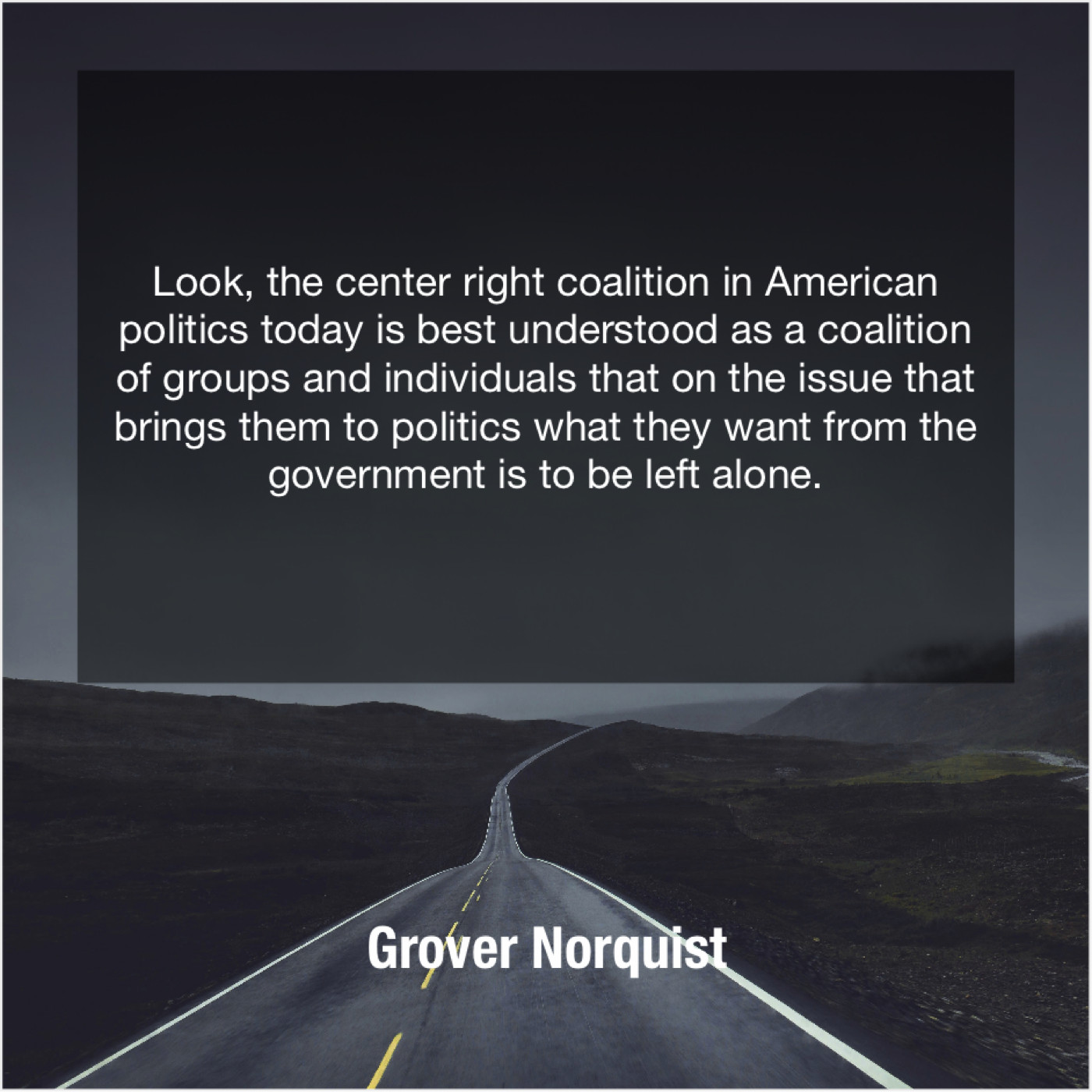 Grover Norquist Grover Norquist – Look, the center right coalition… November 2, 2018 admin “Look, the center right coalition in American politics today is best understood as a coalition of groups and individuals that on the issue that brings them to politics what they want from the government is to be left alone.”-Grover Norquist