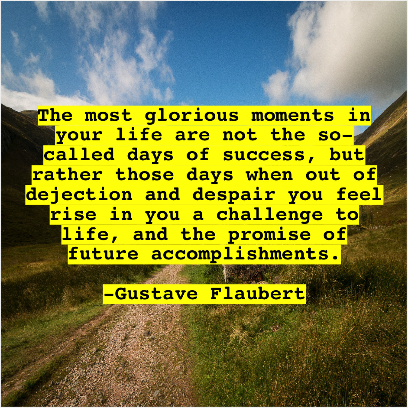 Gustave Flaubert Gustave Flaubert – The most glorious moments in… August 13, 2019 admin “The most glorious moments in your life are not the so-called days of success, but rather those days when out of dejection and despair you feel rise in you a challenge to life, and the promise of future accomplishments.”-Gustave Flaubert