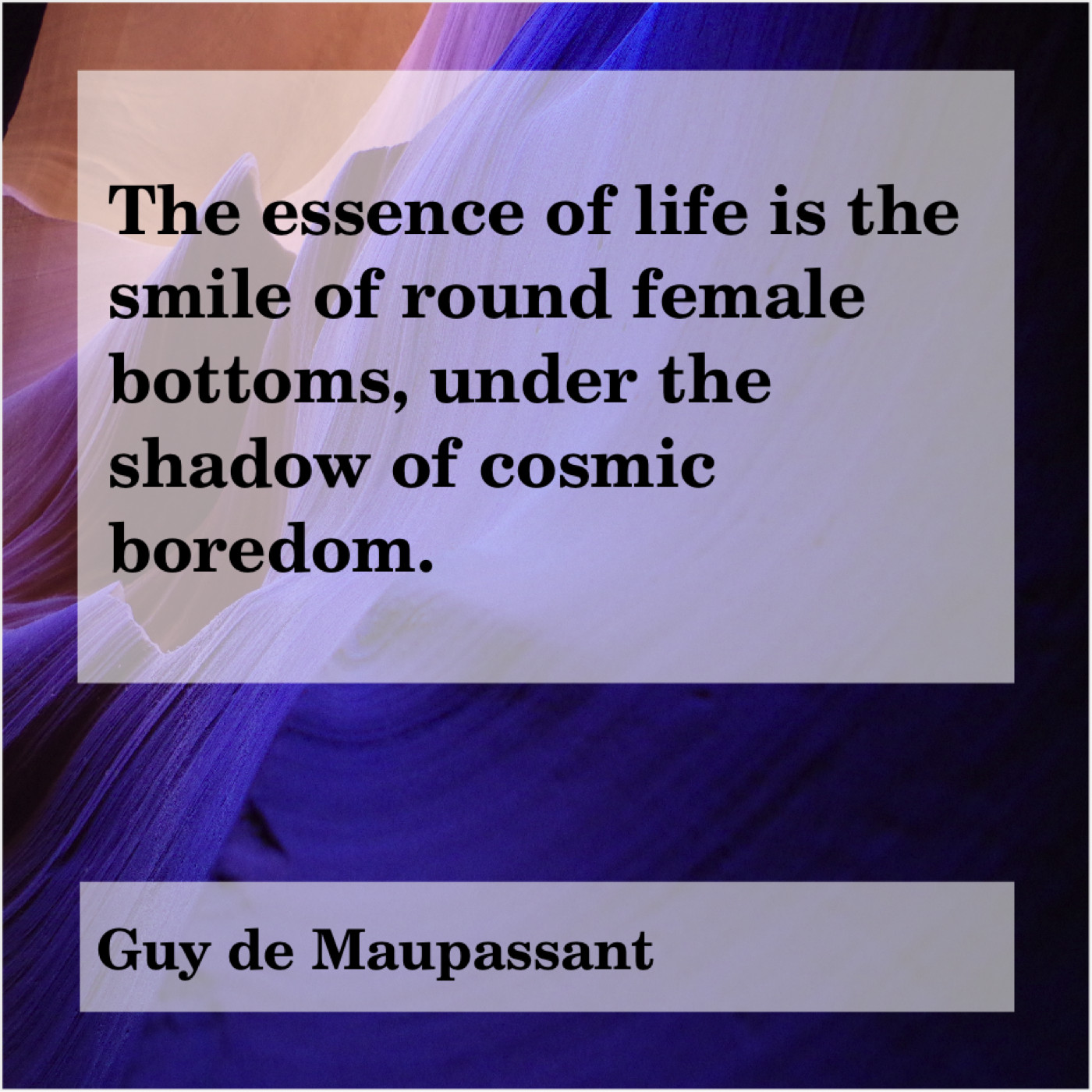 Guy de Maupassant Guy de Maupassant – The essence of life is… February 22, 2019 admin “The essence of life is the smile of round female bottoms, under the shadow of cosmic boredom.”-Guy de Maupassant