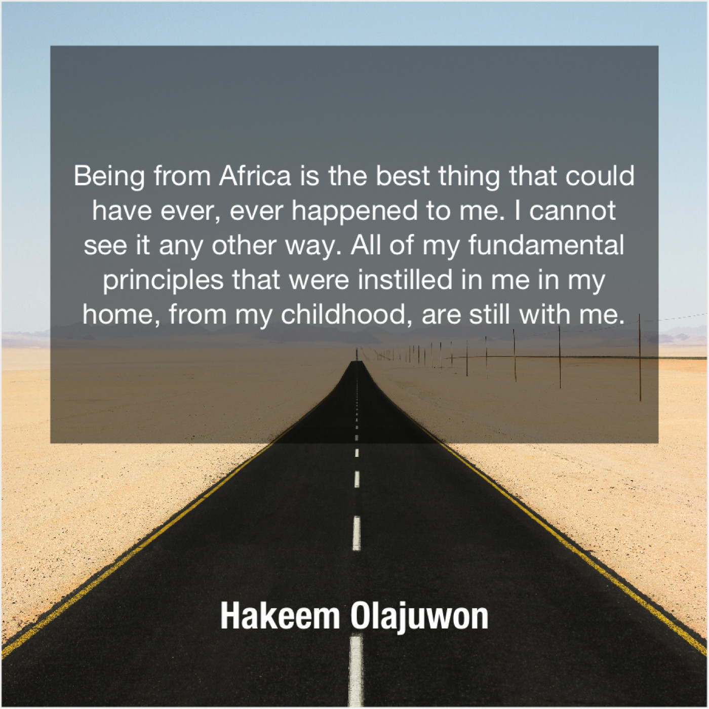 Hakeem Olajuwon Hakeem Olajuwon – Being from Africa is the… January 21, 2019 admin “Being from Africa is the best thing that could have ever, ever happened to me. I cannot see it any other way. All of my fundamental principles that were instilled in me in my home, from my childhood, are still with me.”-Hakeem Olajuwon