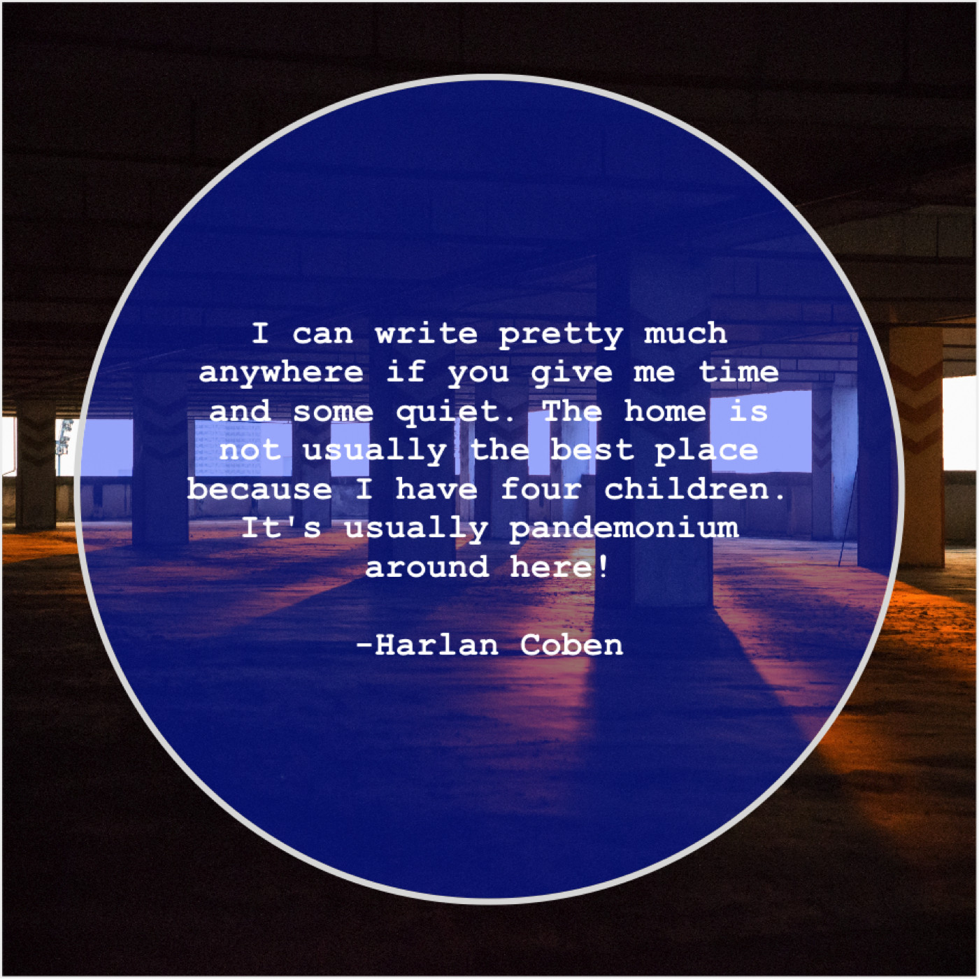 Harlan Coben Harlan Coben – I can write pretty much… June 26, 2019 admin “I can write pretty much anywhere if you give me time and some quiet. The home is not usually the best place because I have four children. It’s usually pandemonium around here!”-Harlan Coben