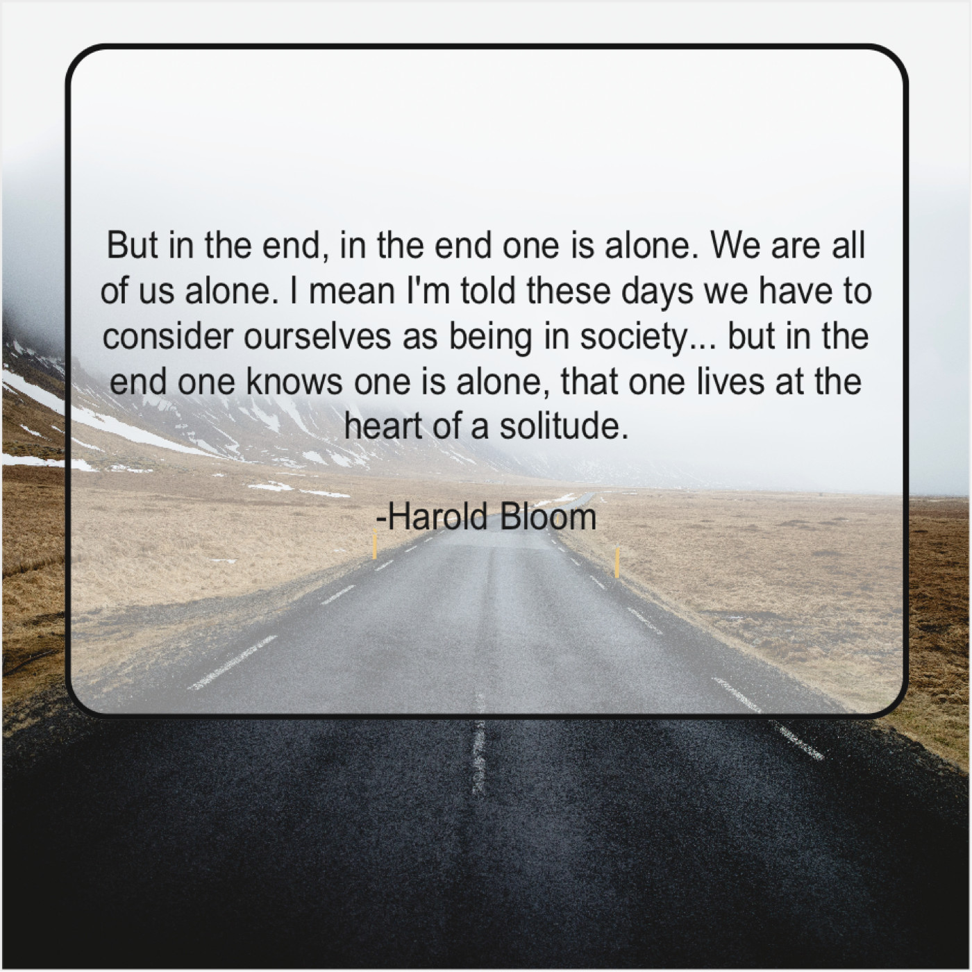 Harold Bloom Harold Bloom – But in the end, in… March 7, 2019 admin “But in the end, in the end one is alone. We are all of us alone. I mean I’m told these days we have to consider ourselves as being in society… but in the end one knows one is alone, that one lives at the heart of a solitude.”-Harold Bloom