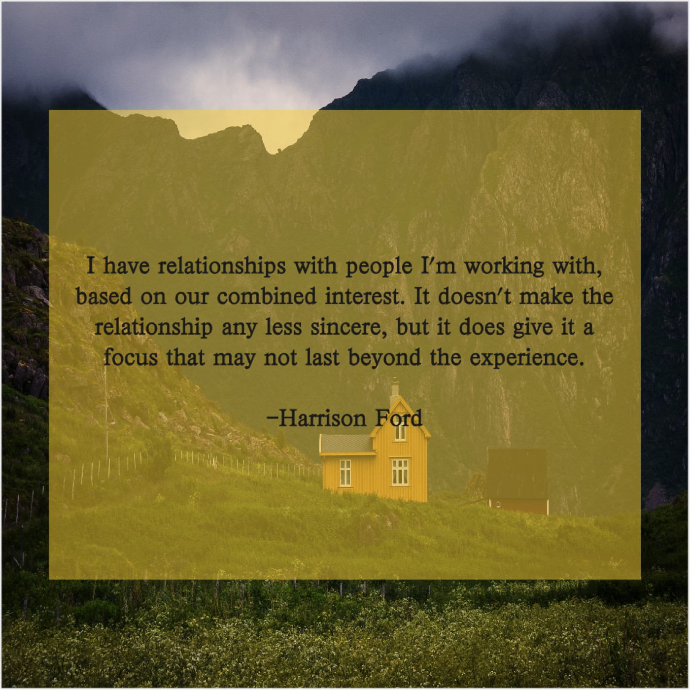 Harrison Ford Harrison Ford – I have relationships with people… April 10, 2019 admin “I have relationships with people I’m working with, based on our combined interest. It doesn’t make the relationship any less sincere, but it does give it a focus that may not last beyond the experience.”-Harrison Ford