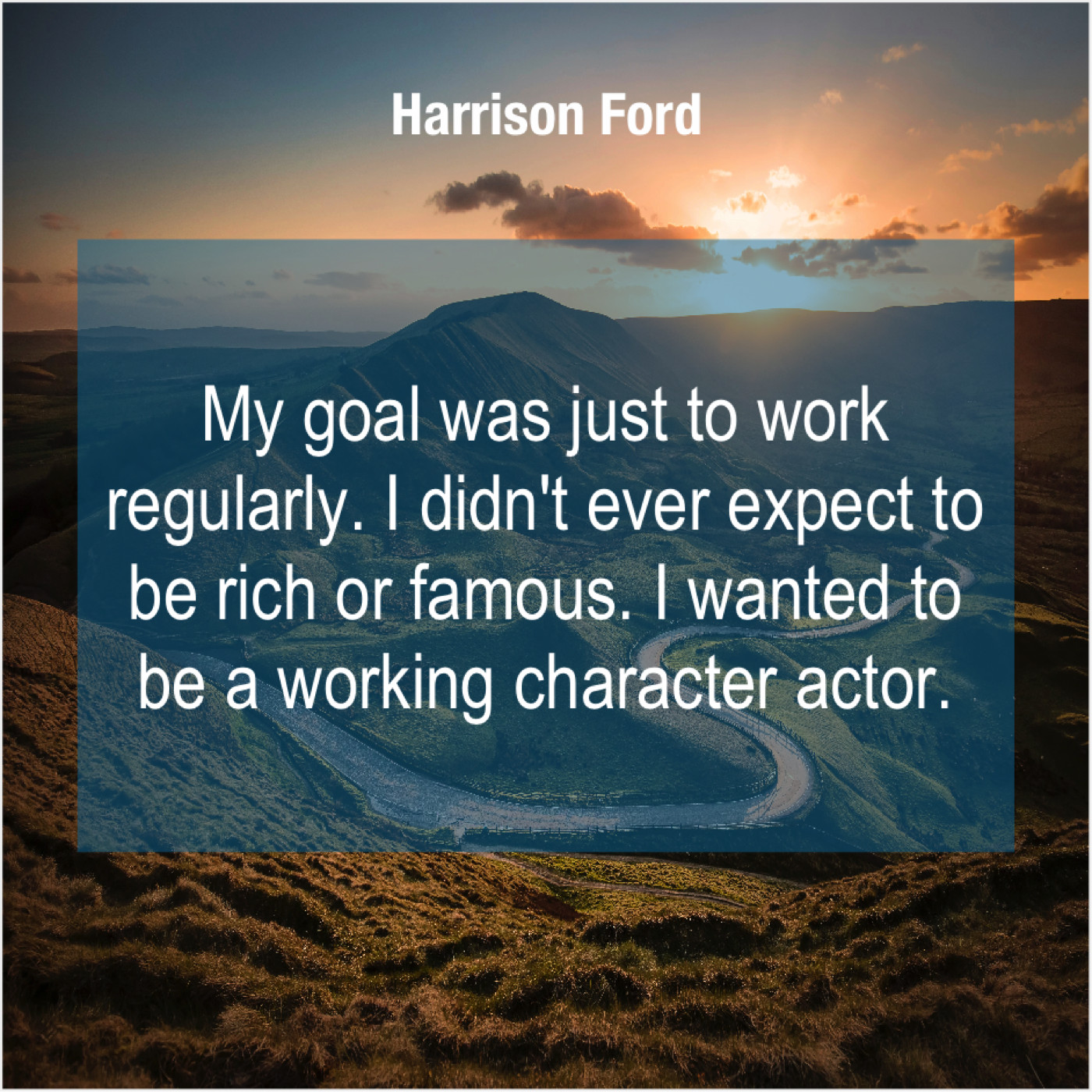 Harrison Ford Harrison Ford – My goal was just to… July 23, 2019 admin “My goal was just to work regularly. I didn’t ever expect to be rich or famous. I wanted to be a working character actor.”-Harrison Ford