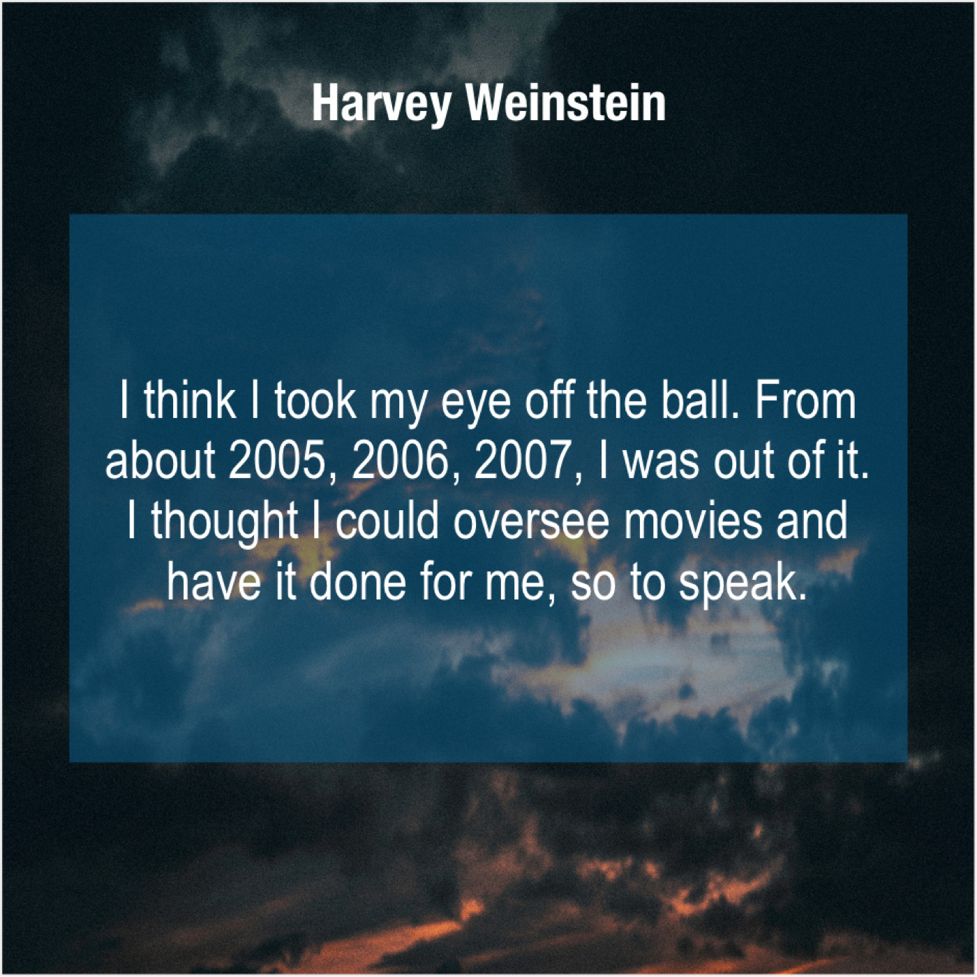 Harvey Weinstein Harvey Weinstein – I think I took my… July 18, 2019 admin “I think I took my eye off the ball. From about 2005, 2006, 2007, I was out of it. I thought I could oversee movies and have it done for me, so to speak.”-Harvey Weinstein