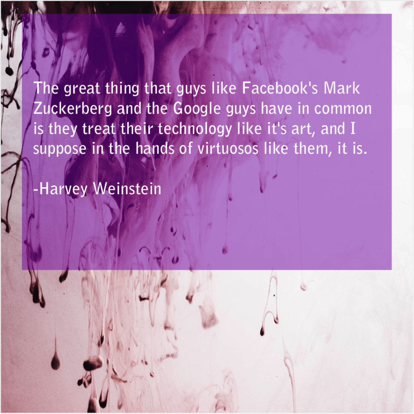Harvey Weinstein Harvey Weinstein – The great thing that guys… December 14, 2018 admin “The great thing that guys like Facebook’s Mark Zuckerberg and the Google guys have in common is they treat their technology like it’s art, and I suppose in the hands of virtuosos like them, it is.”-Harvey Weinstein