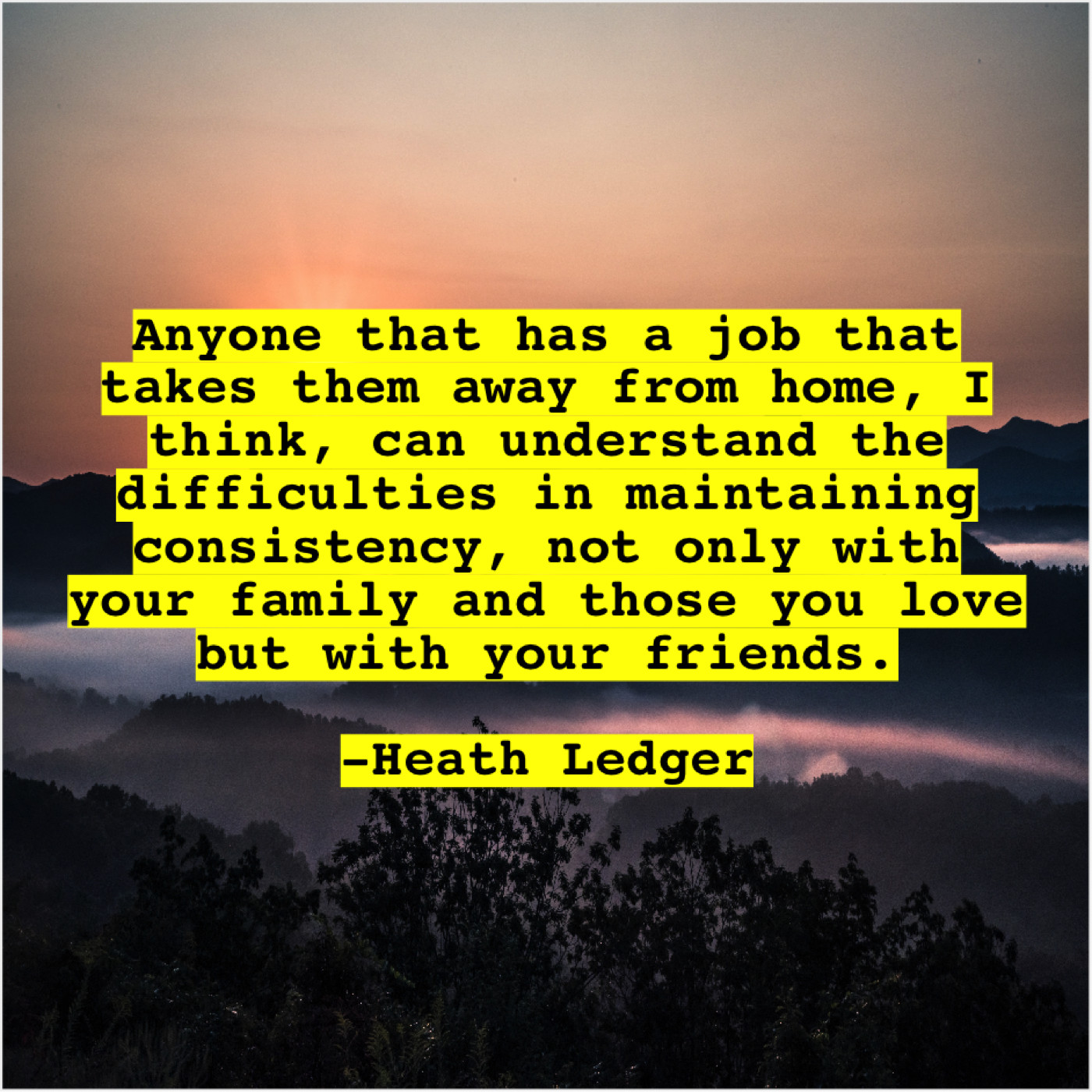 Heath Ledger Heath Ledger – Anyone that has a job… June 3, 2019 admin “Anyone that has a job that takes them away from home, I think, can understand the difficulties in maintaining consistency, not only with your family and those you love but with your friends.”-Heath Ledger