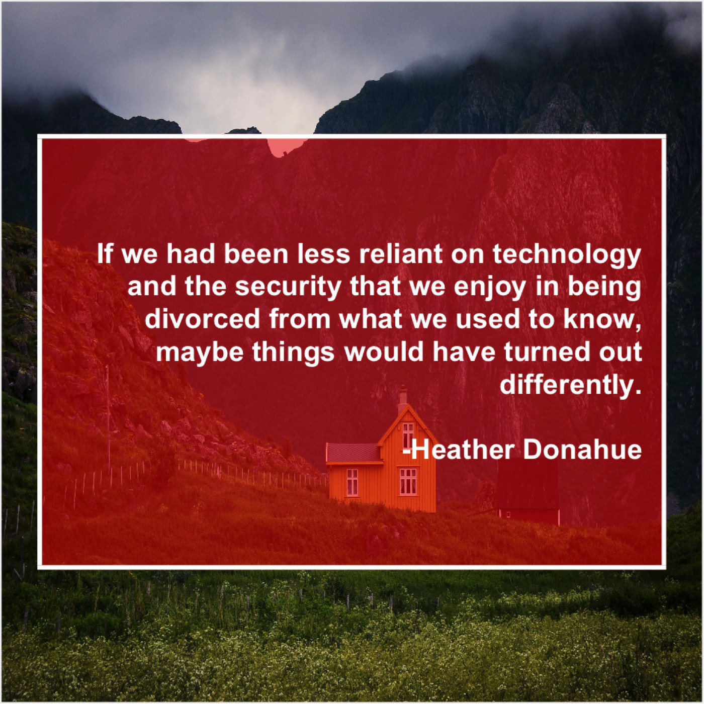 Heather Donahue Heather Donahue – If we had been less… June 30, 2019 admin “If we had been less reliant on technology and the security that we enjoy in being divorced from what we used to know, maybe things would have turned out differently.”-Heather Donahue