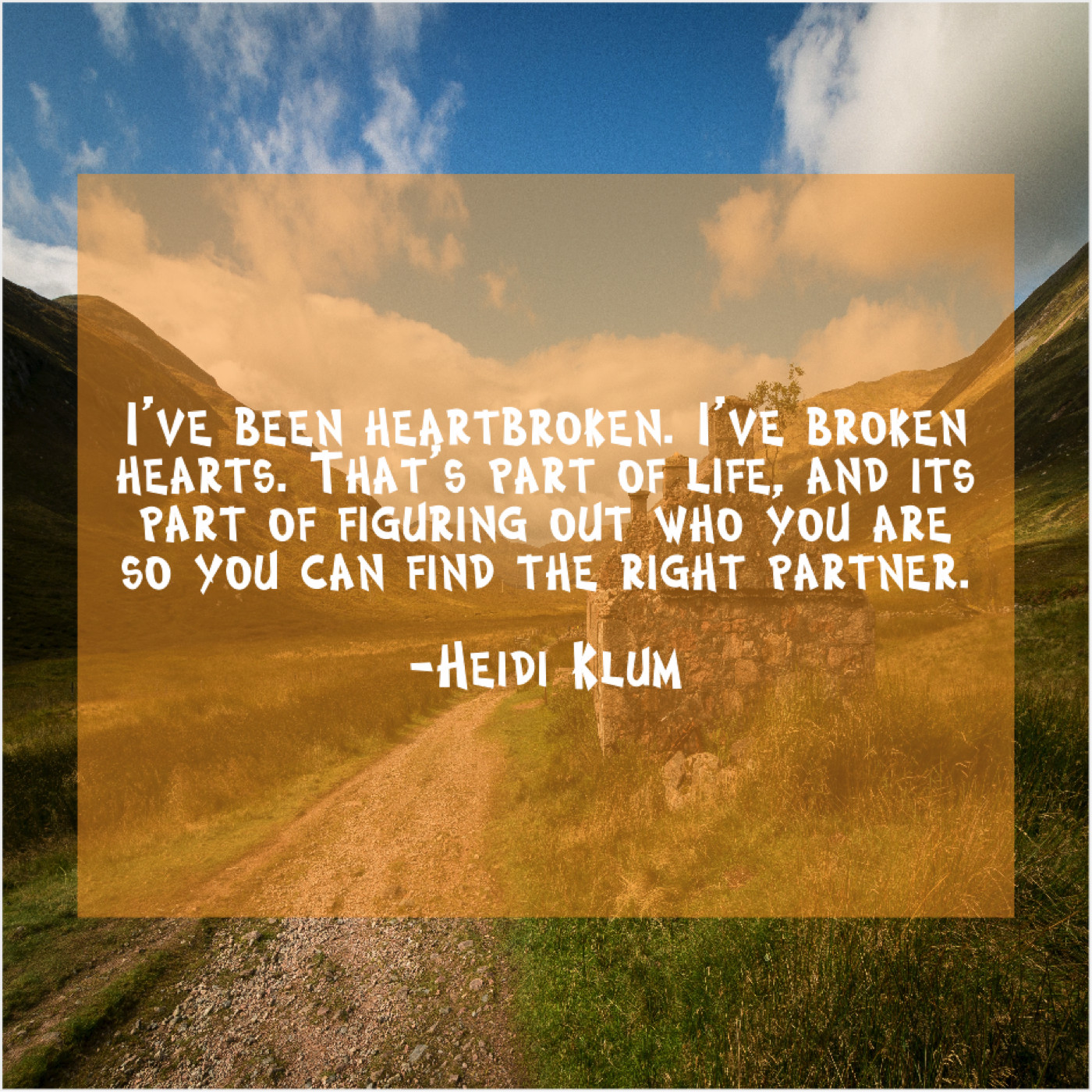 Heidi Klum Heidi Klum – I’ve been heartbroken. I’ve broken… September 10, 2019 admin “I’ve been heartbroken. I’ve broken hearts. That’s part of life, and its part of figuring out who you are so you can find the right partner.”-Heidi Klum