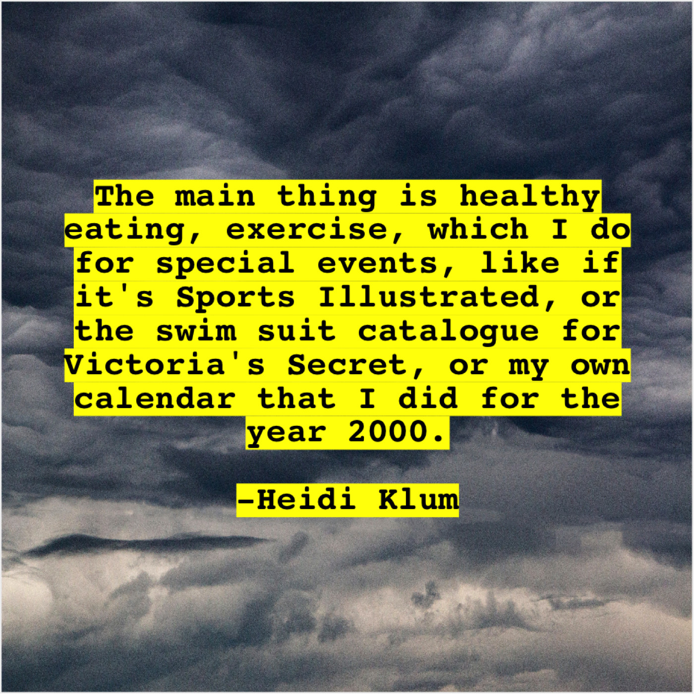 Heidi Klum Heidi Klum – The main thing is healthy… July 23, 2019 admin “The main thing is healthy eating, exercise, which I do for special events, like if it’s Sports Illustrated, or the swim suit catalogue for Victoria’s Secret, or my own calendar that I did for the year 2000.”-Heidi Klum
