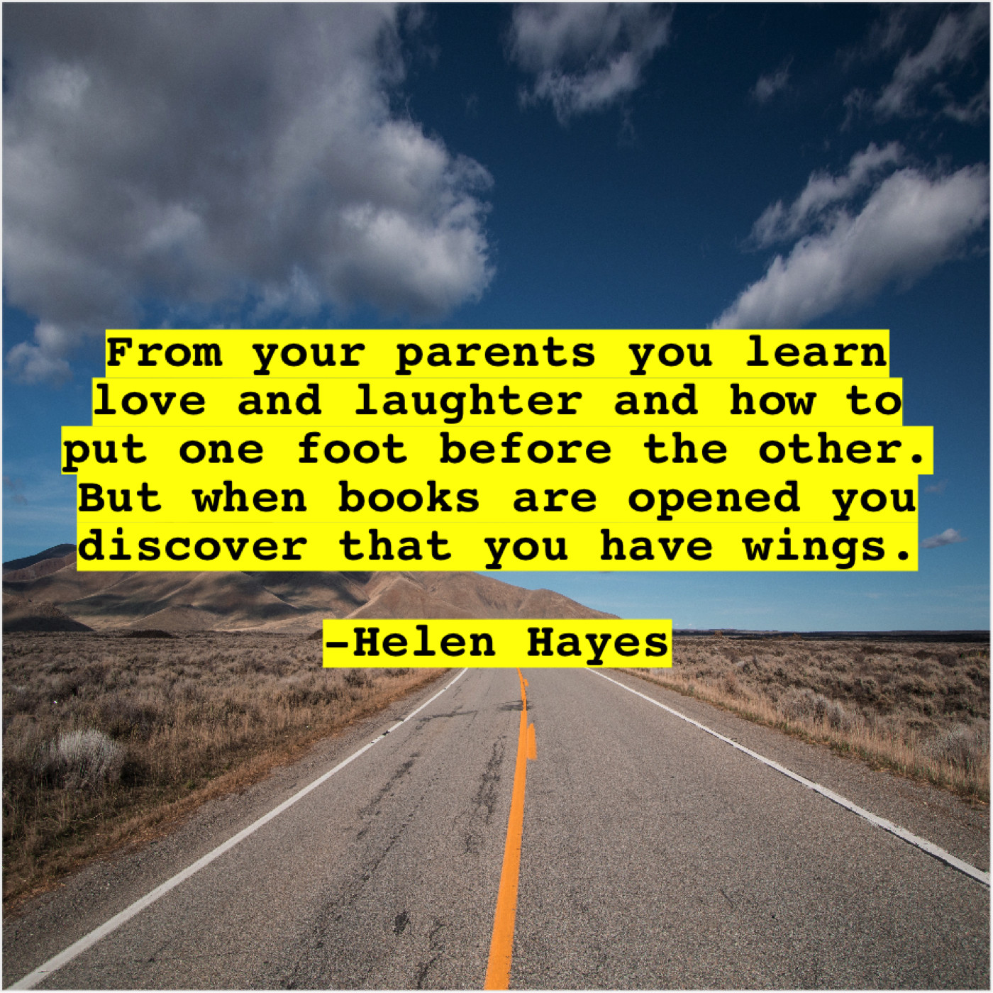 Helen Hayes Helen Hayes – From your parents you learn… March 11, 2019 admin “From your parents you learn love and laughter and how to put one foot before the other. But when books are opened you discover that you have wings.”-Helen Hayes