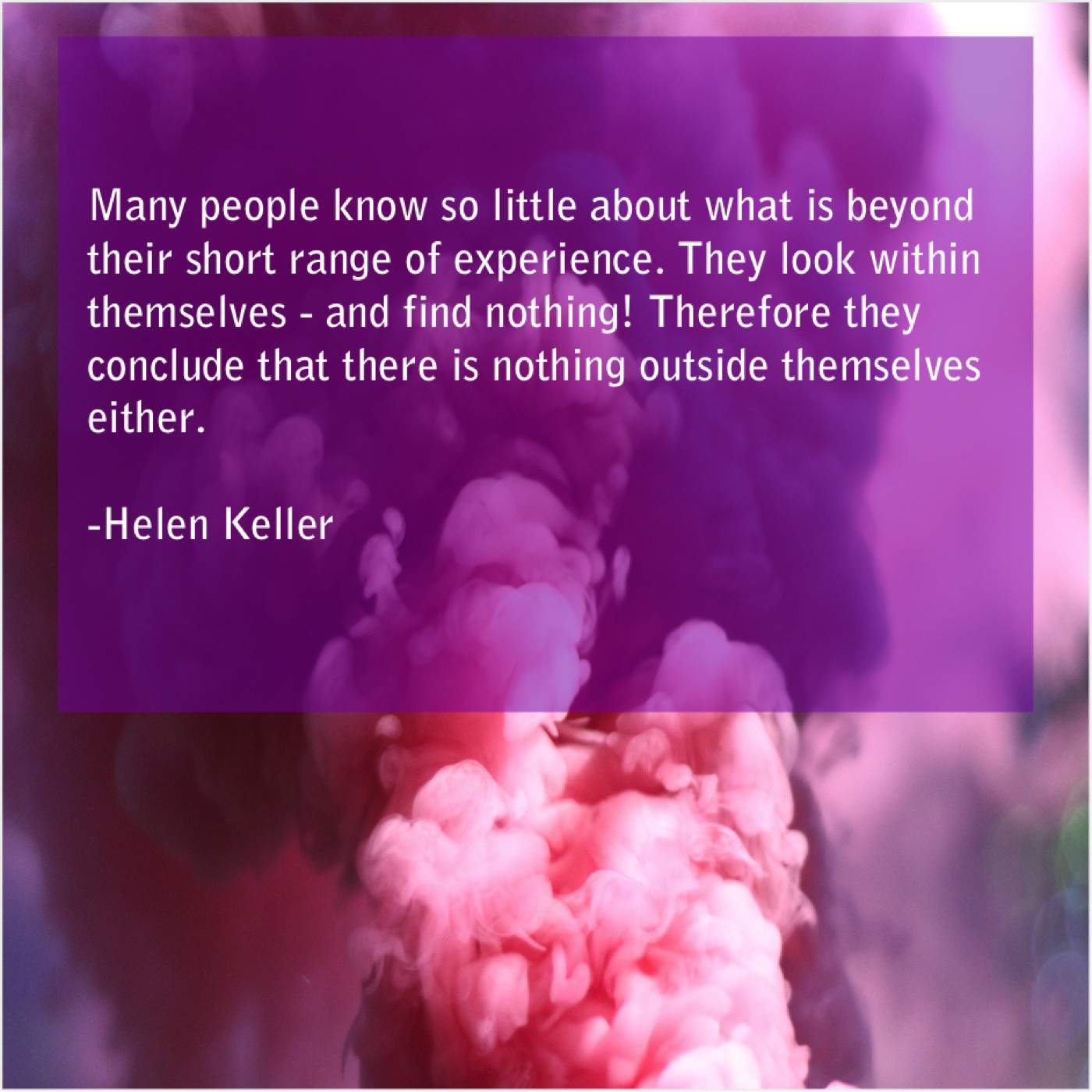 Helen Keller Helen Keller – Many people know so little… August 14, 2019 admin “Many people know so little about what is beyond their short range of experience. They look within themselves – and find nothing! Therefore they conclude that there is nothing outside themselves either.”-Helen Keller