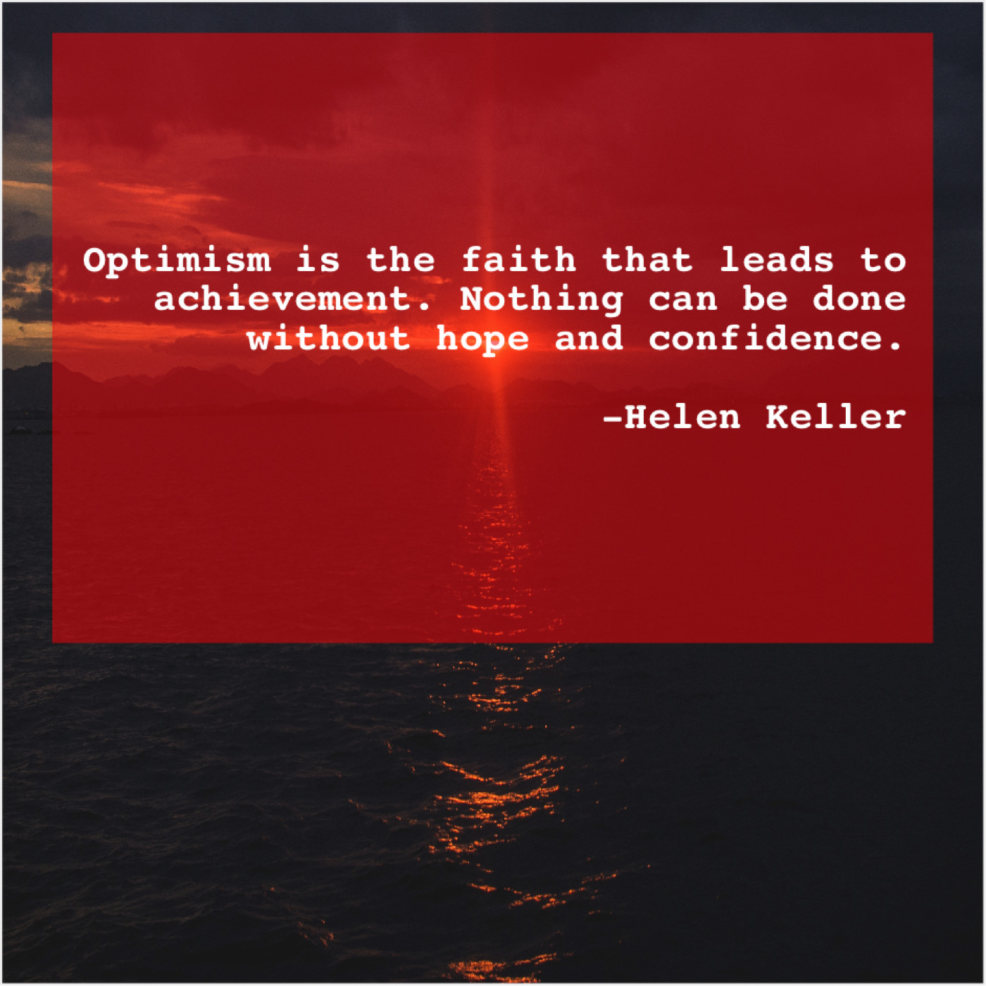 Helen Keller Helen Keller – Optimism is the faith that… August 13, 2019 admin “Optimism is the faith that leads to achievement. Nothing can be done without hope and confidence.”-Helen Keller
