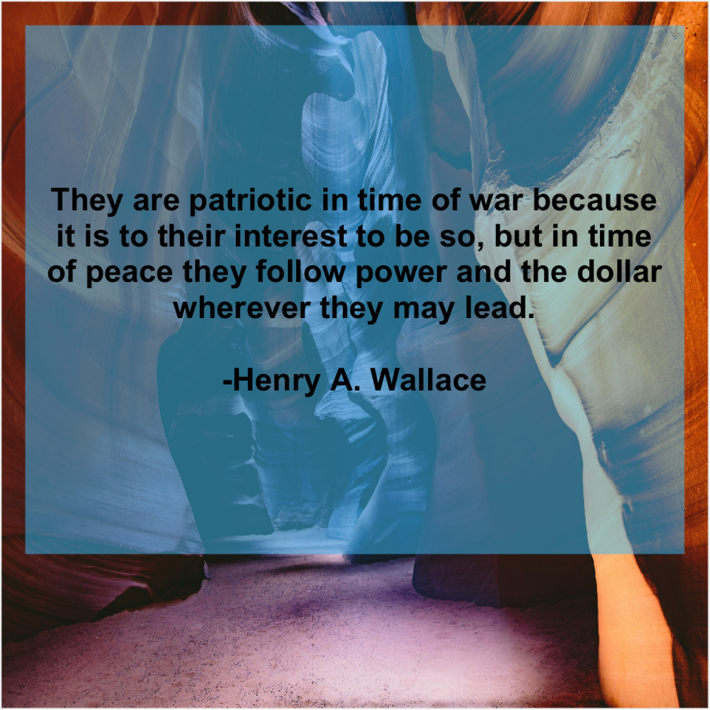 Henry A. Wallace Henry A. Wallace – They are patriotic in time… November 26, 2018 admin “They are patriotic in time of war because it is to their interest to be so, but in time of peace they follow power and the dollar wherever they may lead.”-Henry A. Wallace