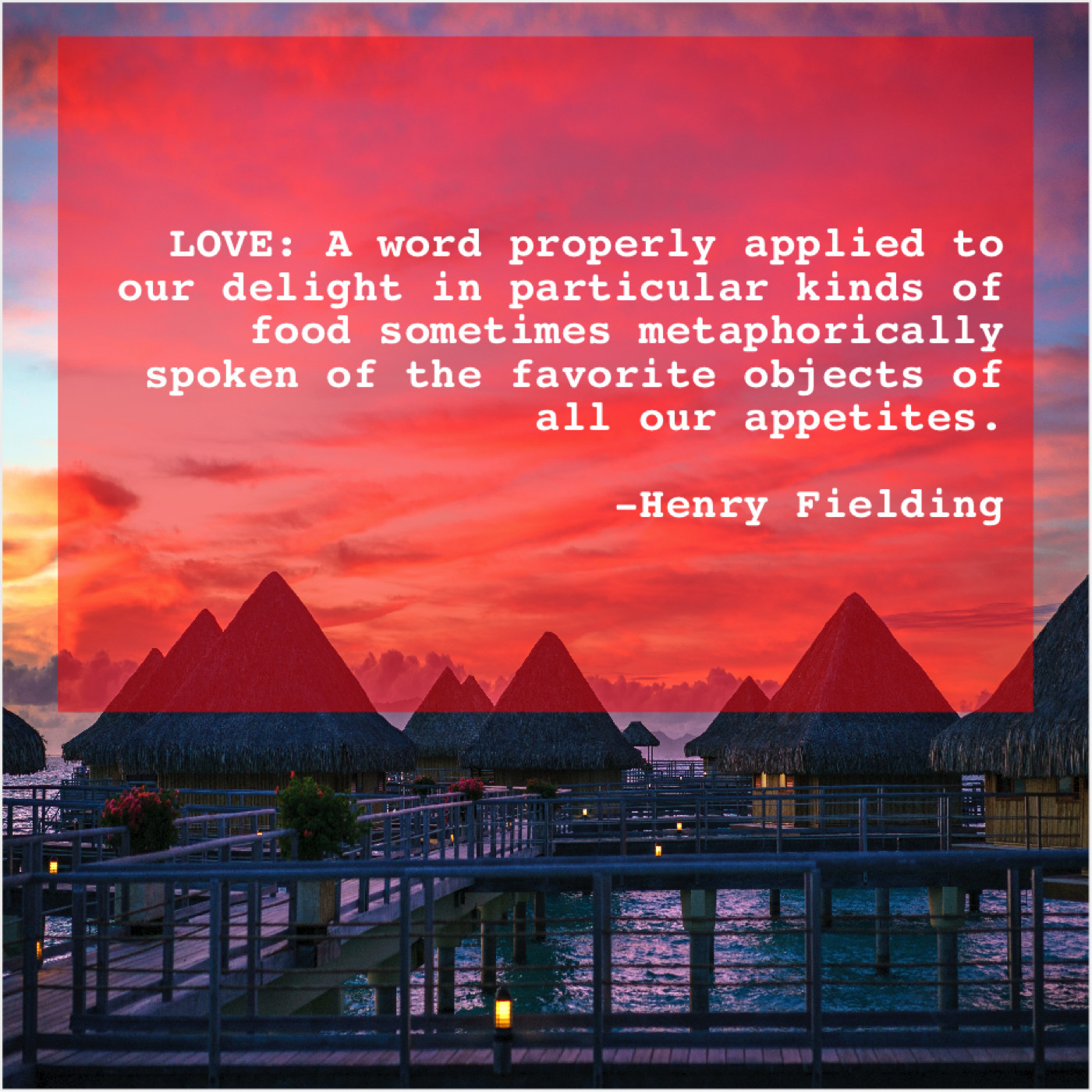 Henry Fielding Henry Fielding – LOVE: A word properly applied… April 20, 2019 admin “LOVE: A word properly applied to our delight in particular kinds of food sometimes metaphorically spoken of the favorite objects of all our appetites.”-Henry Fielding