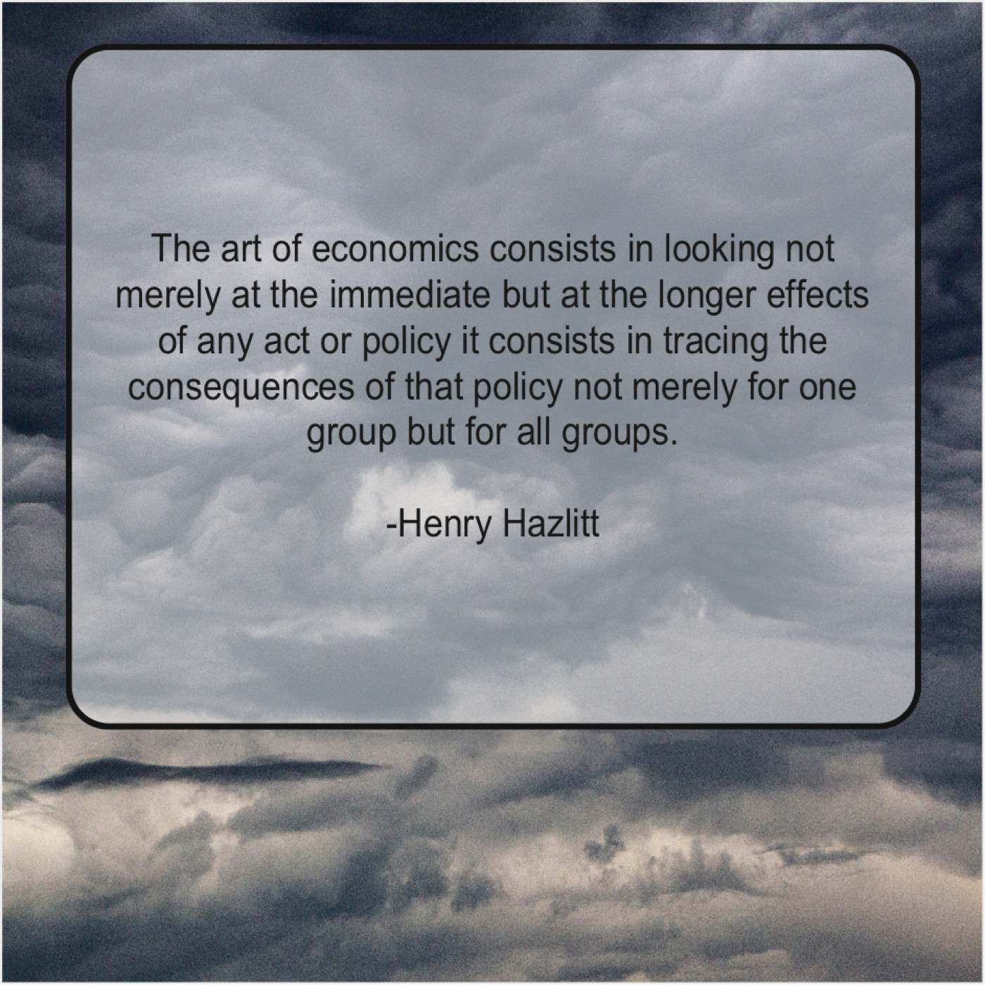 Henry Hazlitt Henry Hazlitt – The art of economics consists… April 2, 2019 admin “The art of economics consists in looking not merely at the immediate but at the longer effects of any act or policy it consists in tracing the consequences of that policy not merely for one group but for all groups.”-Henry Hazlitt