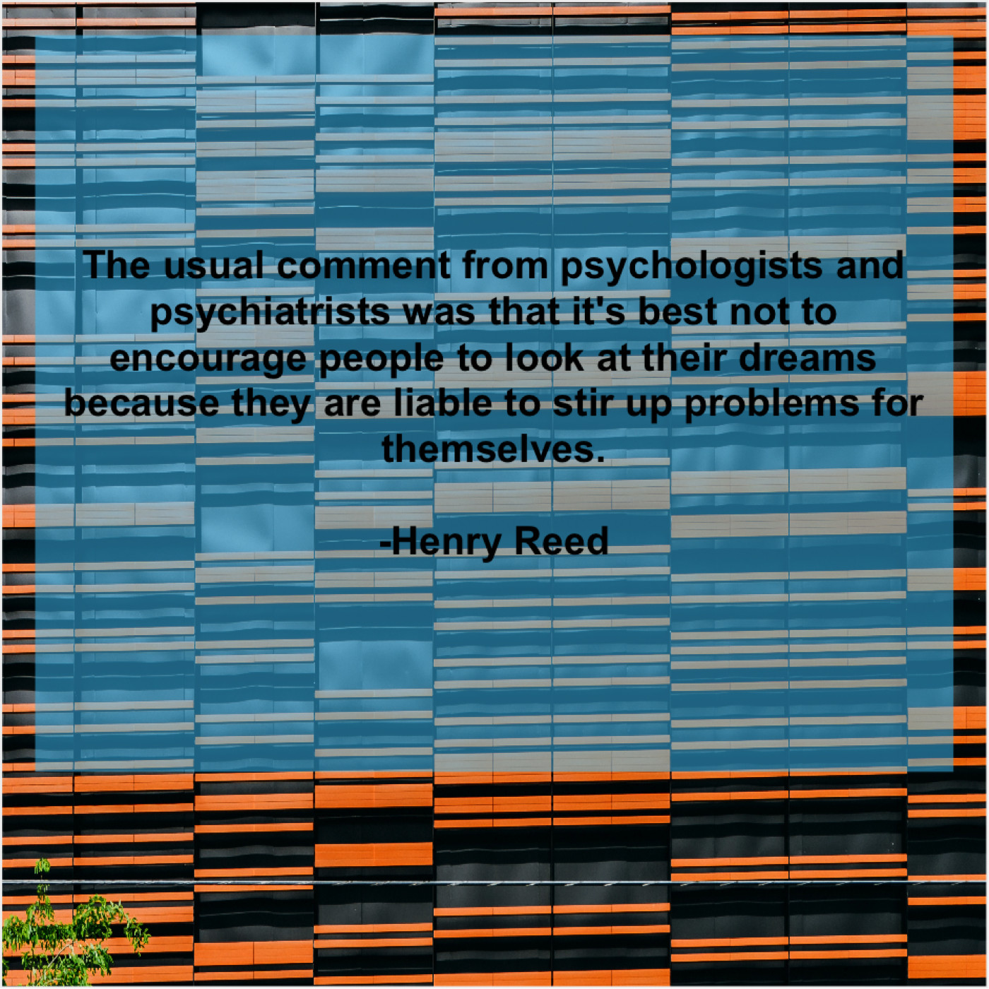 Henry Reed Henry Reed – The usual comment from psychologists… May 4, 2019 admin “The usual comment from psychologists and psychiatrists was that it’s best not to encourage people to look at their dreams because they are liable to stir up problems for themselves.”-Henry Reed