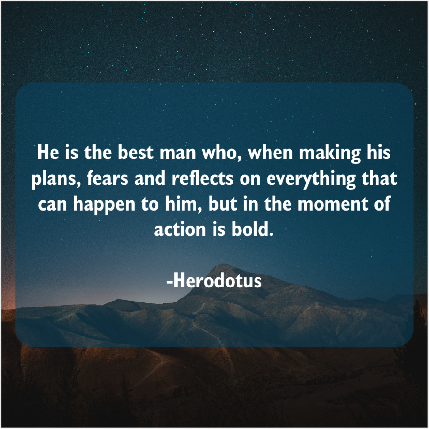 Herodotus Herodotus – He is the best man… April 10, 2019 admin “He is the best man who, when making his plans, fears and reflects on everything that can happen to him, but in the moment of action is bold.”-Herodotus