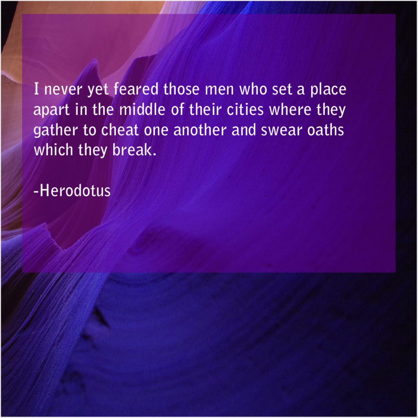 Herodotus Herodotus – I never yet feared those… May 23, 2019 admin “I never yet feared those men who set a place apart in the middle of their cities where they gather to cheat one another and swear oaths which they break.”-Herodotus