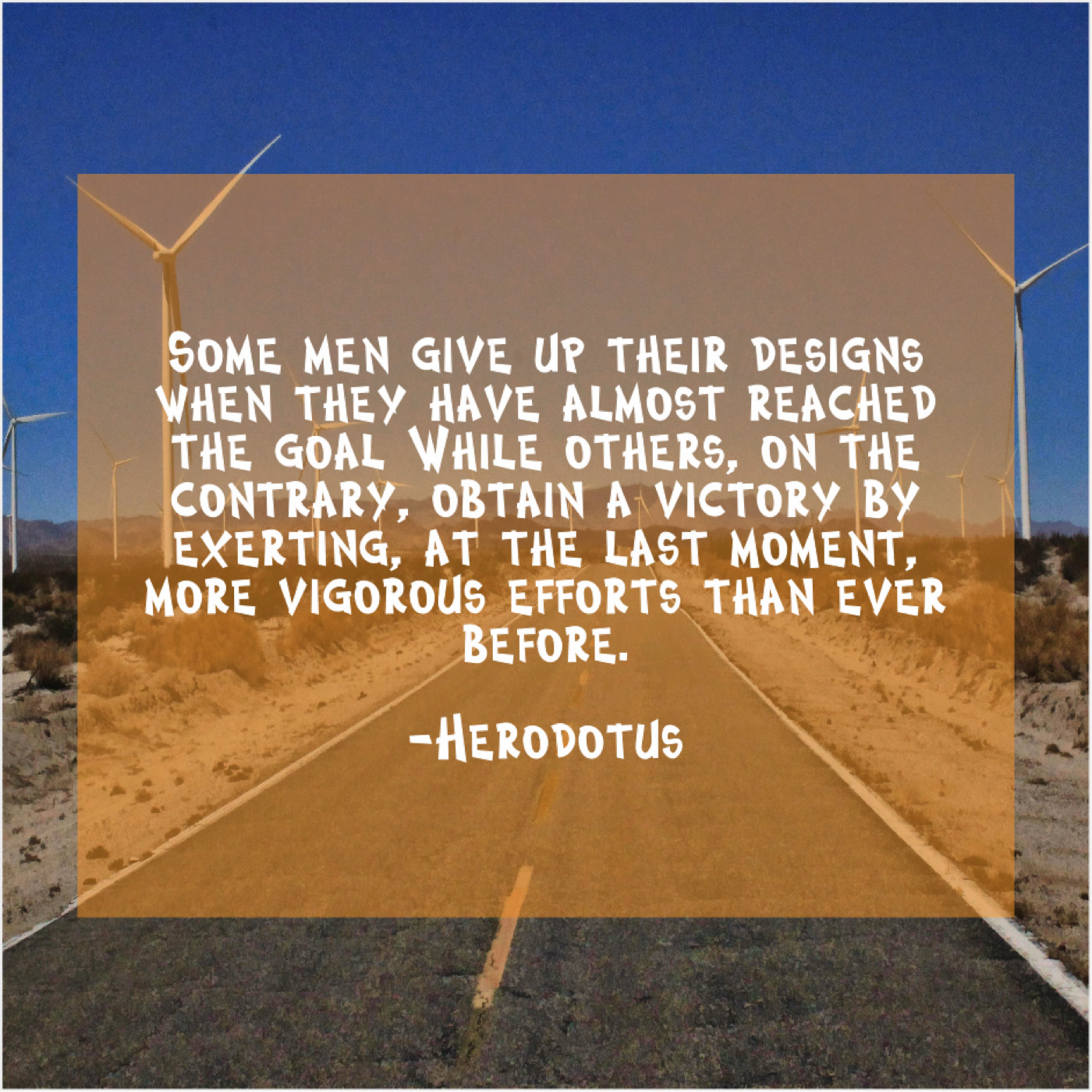 Herodotus Herodotus – Some men give up their… July 25, 2019 admin “Some men give up their designs when they have almost reached the goal While others, on the contrary, obtain a victory by exerting, at the last moment, more vigorous efforts than ever before.”-Herodotus