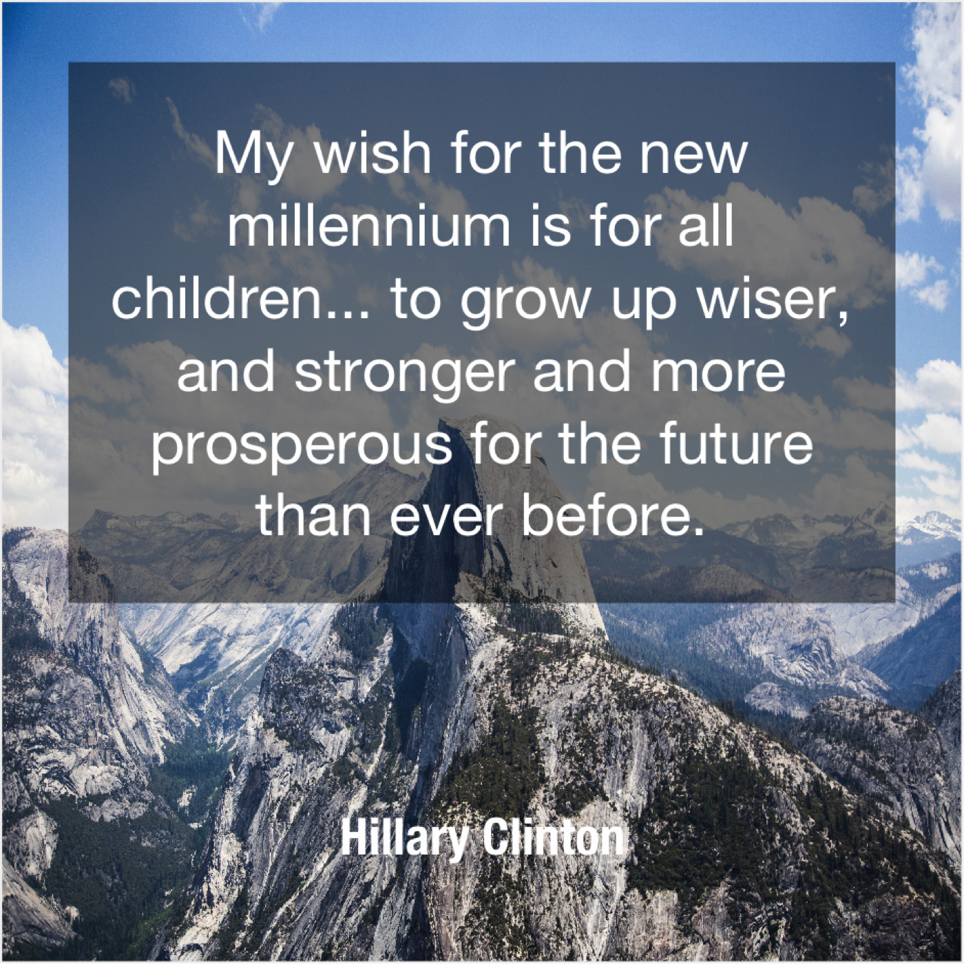 Hillary Clinton Hillary Clinton – My wish for the new… October 20, 2019 admin “My wish for the new millennium is for all children… to grow up wiser, and stronger and more prosperous for the future than ever before.”-Hillary Clinton