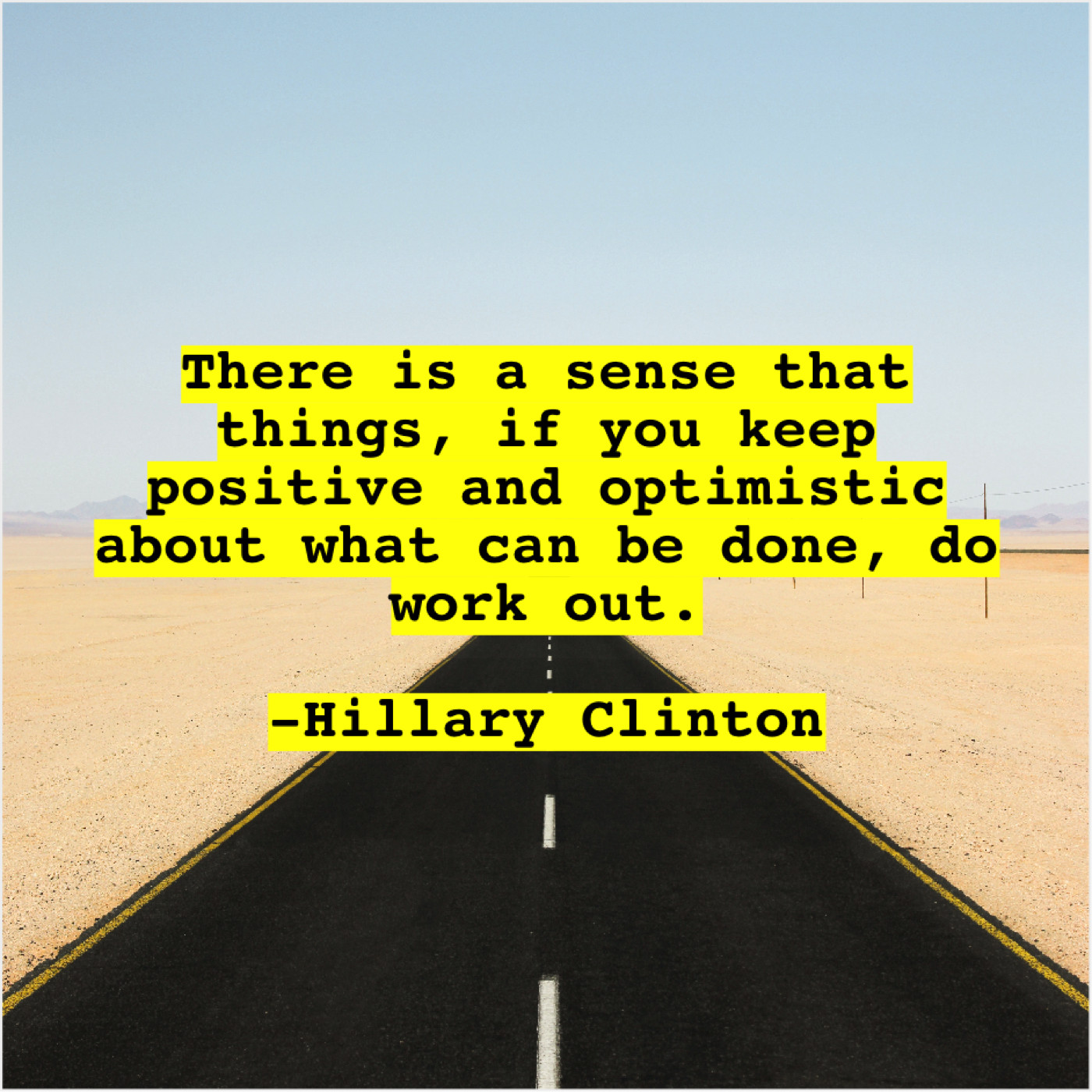 Hillary Clinton Hillary Clinton – There is a sense that… April 30, 2019 admin “There is a sense that things, if you keep positive and optimistic about what can be done, do work out.”-Hillary Clinton