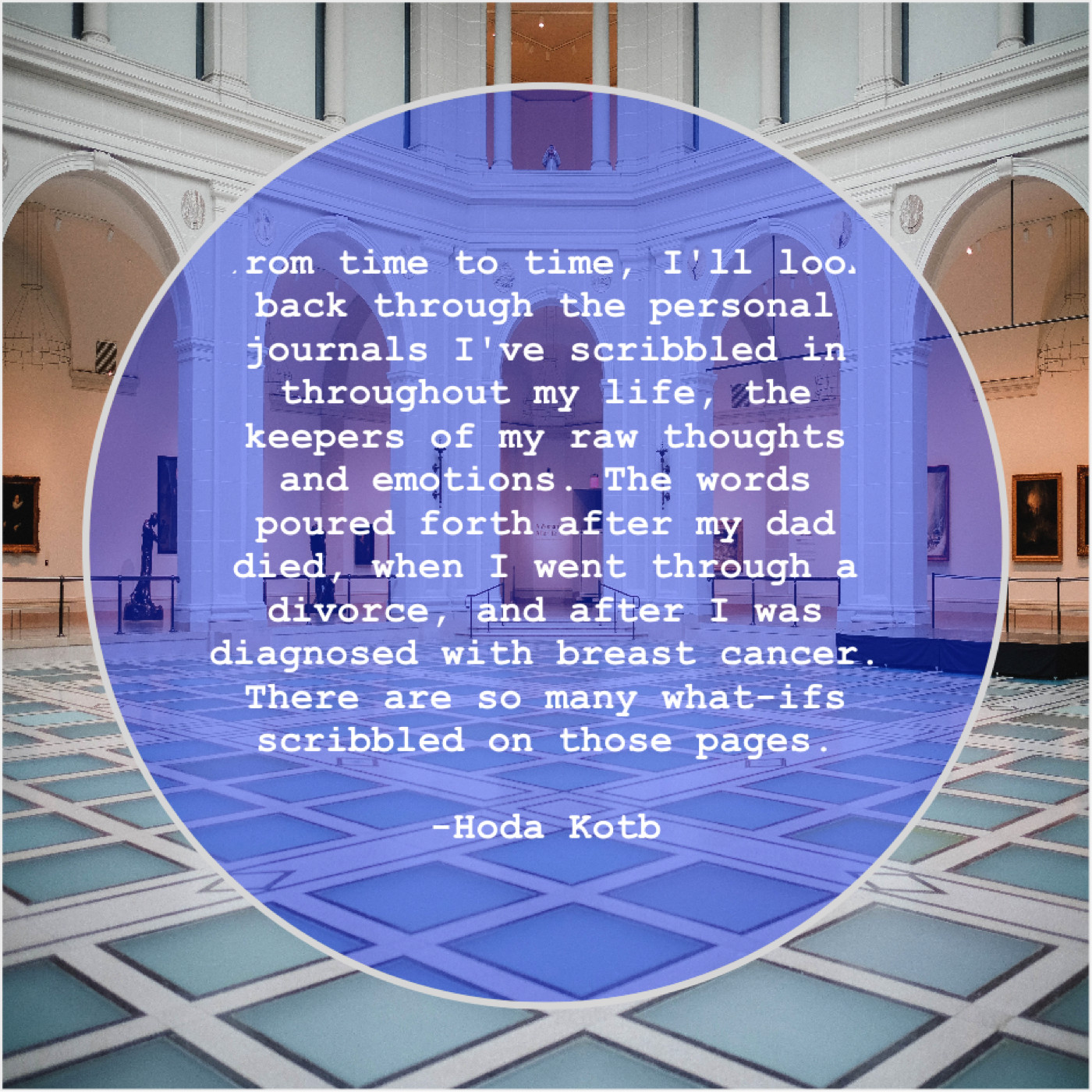 “From time to time, I’ll look back through the personal journals I’ve scribbled in throughout my life, the keepers of my raw thoughts and emotions. The words poured forth after my dad died, when I went through a divorce, and after I was diagnosed with breast cancer. There are so many what-ifs scribbled on those pages.”