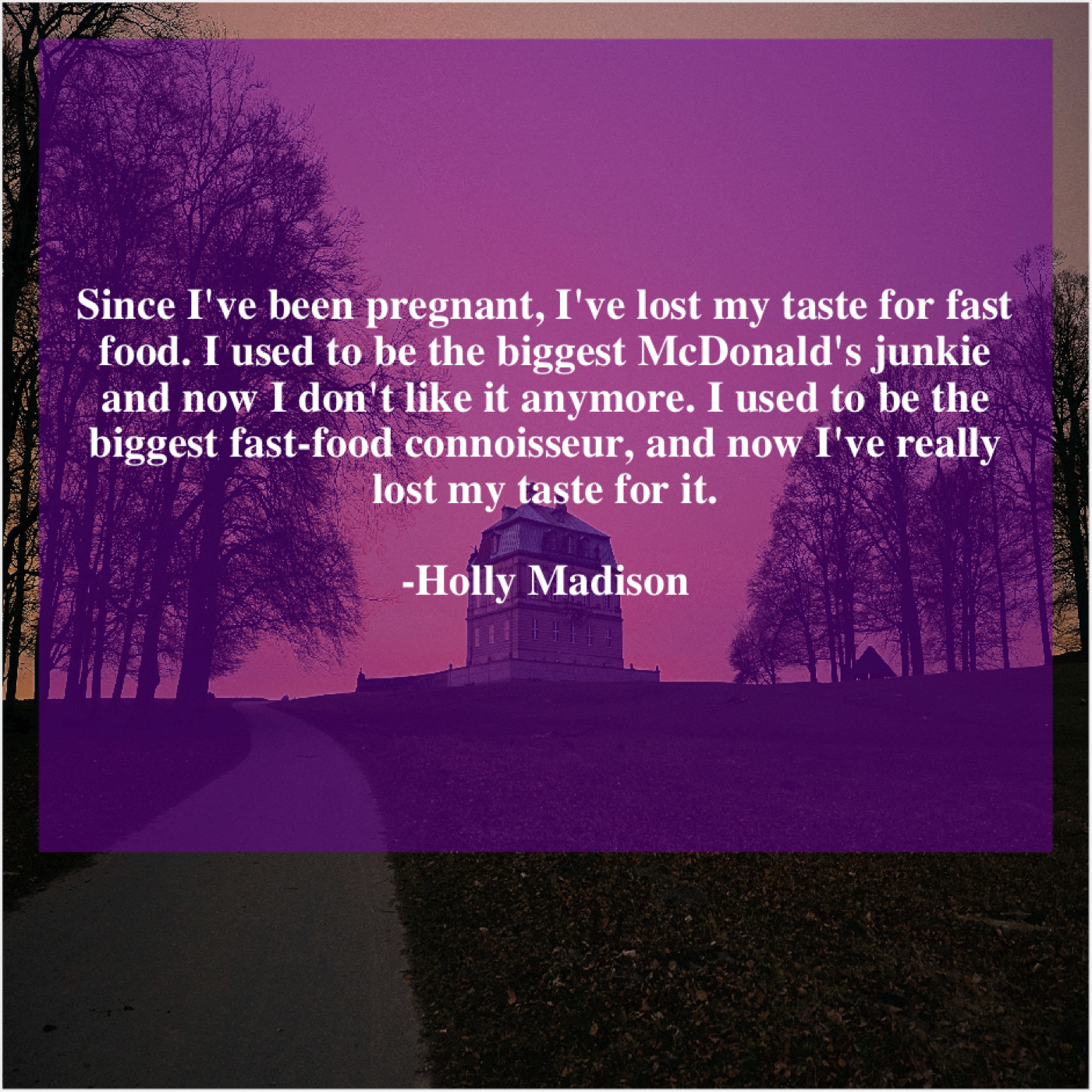 Holly Madison Holly Madison – Since I’ve been pregnant, I’ve… July 27, 2019 admin “Since I’ve been pregnant, I’ve lost my taste for fast food. I used to be the biggest McDonald’s junkie and now I don’t like it anymore. I used to be the biggest fast-food connoisseur, and now I’ve really lost my taste for it.”-Holly Madison
