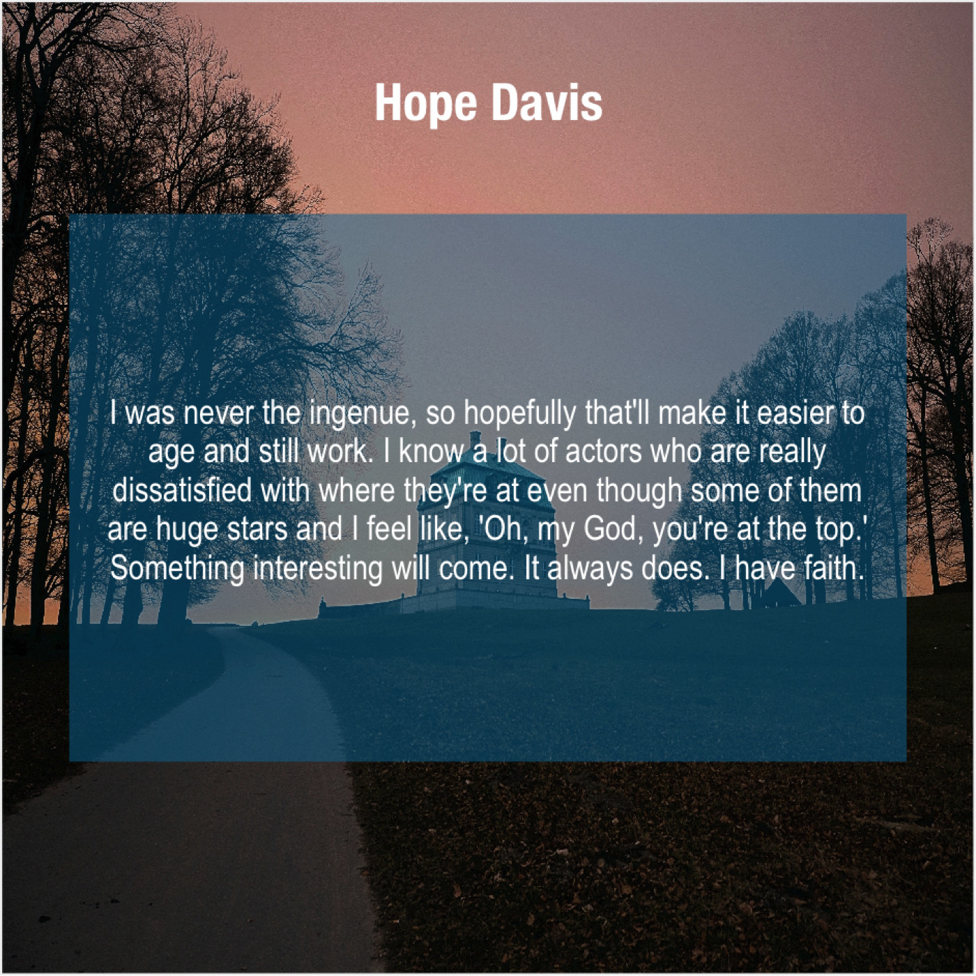“I was never the ingenue, so hopefully that’ll make it easier to age and still work. I know a lot of actors who are really dissatisfied with where they’re at even though some of them are huge stars and I feel like, ‘Oh, my God, you’re at the top.’ Something interesting will come. It always does. I have faith.”